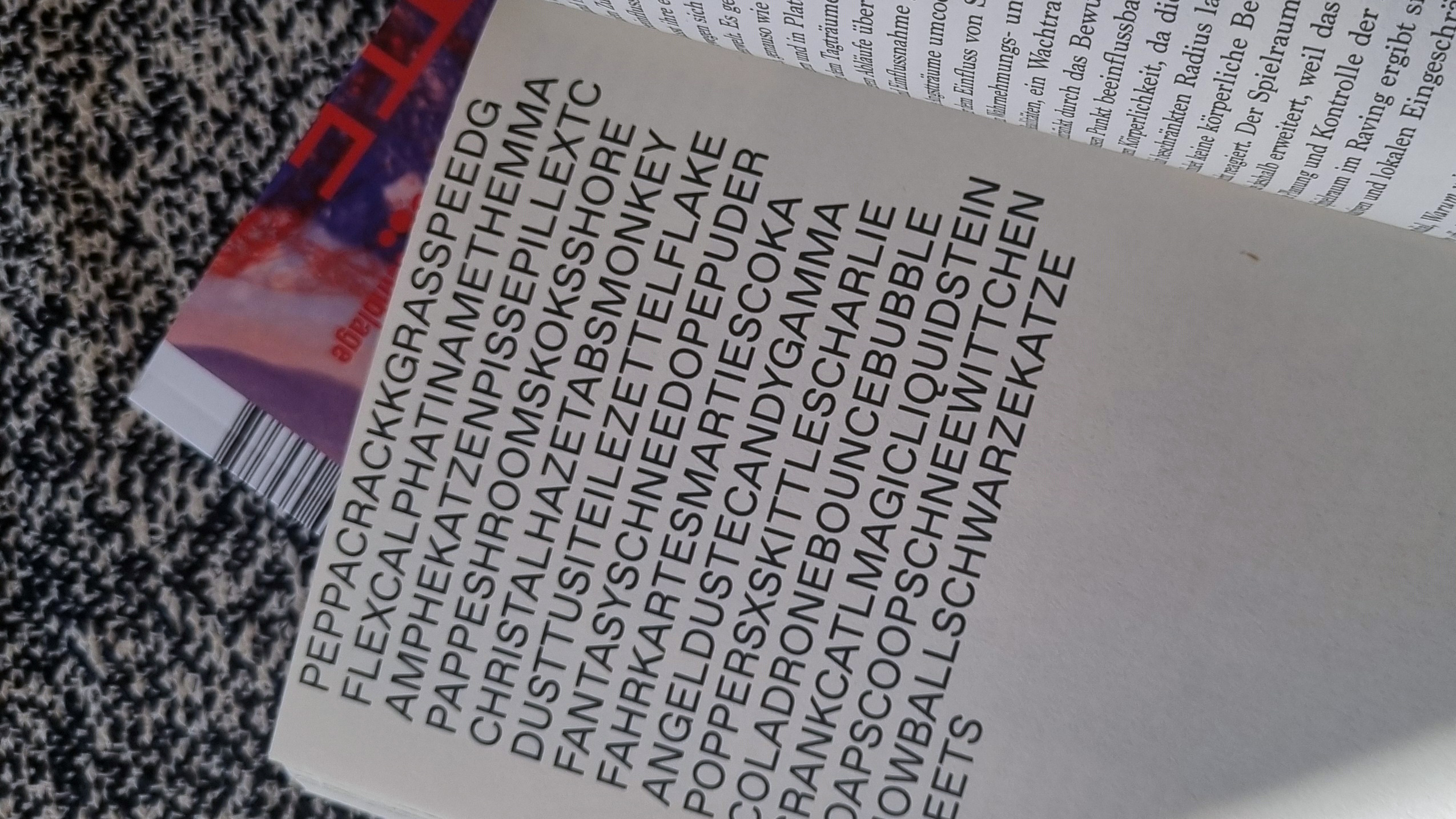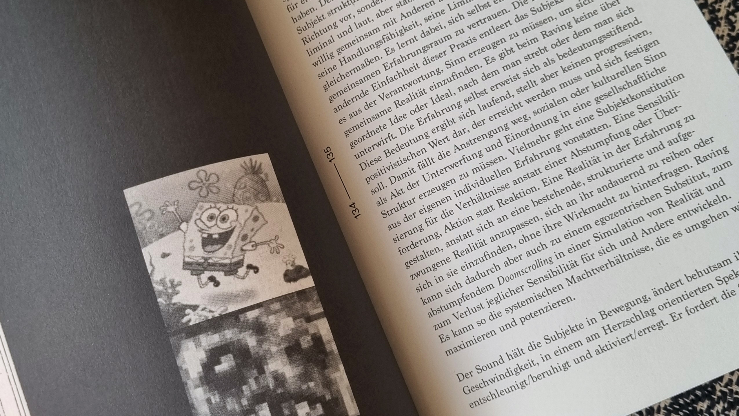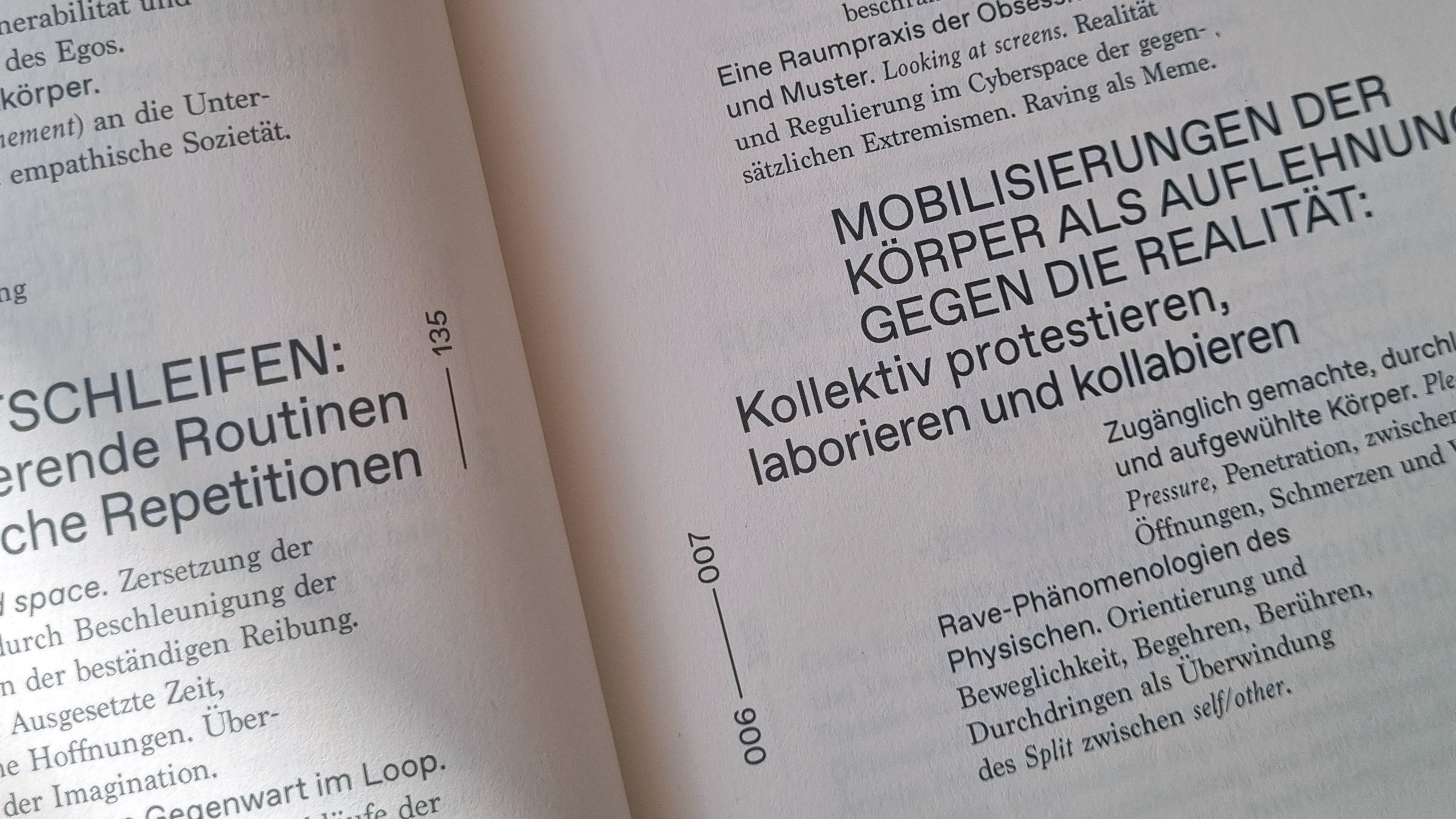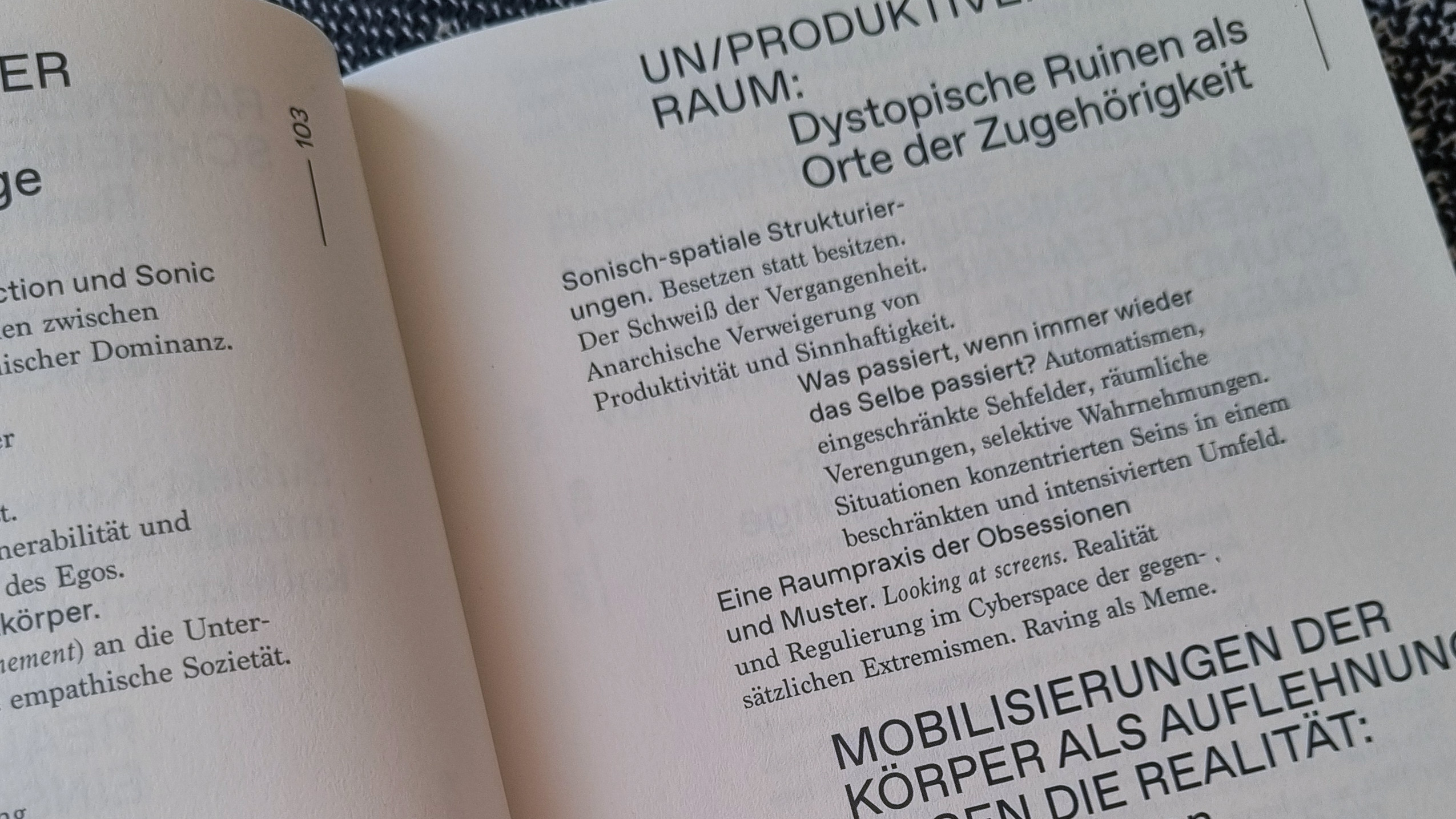 (en) How to trace the ambiguous textures and texturings of one's own subjective, critical corporeality, which continually shifts within the monotonous beat, which repeats and reconfigures itself in the constant movement? How to inscribe oneself into a situational-collective bodily machinery determined by the vibrations of sound and stubbornly working on a desire for the alienated other? How to inscribe oneself into a reality that temporarily and situationally eludes the metastasizing communal body that calls itself society? The liminal practice of raving reveals itself less as a sociocultural counter-presentation of a temporarily self-sustaining intersubjective practice between self-forgetfulness and self-centeredness. Rather, it can be understood as an act of reassurance and refusal, between affirmation and loss of the subjective. It expands into the unspeakable, the irrational, and the strange in a deliberate and pleasurable distortion. The only possible way to move through these alien realities is with an open and broken heart.