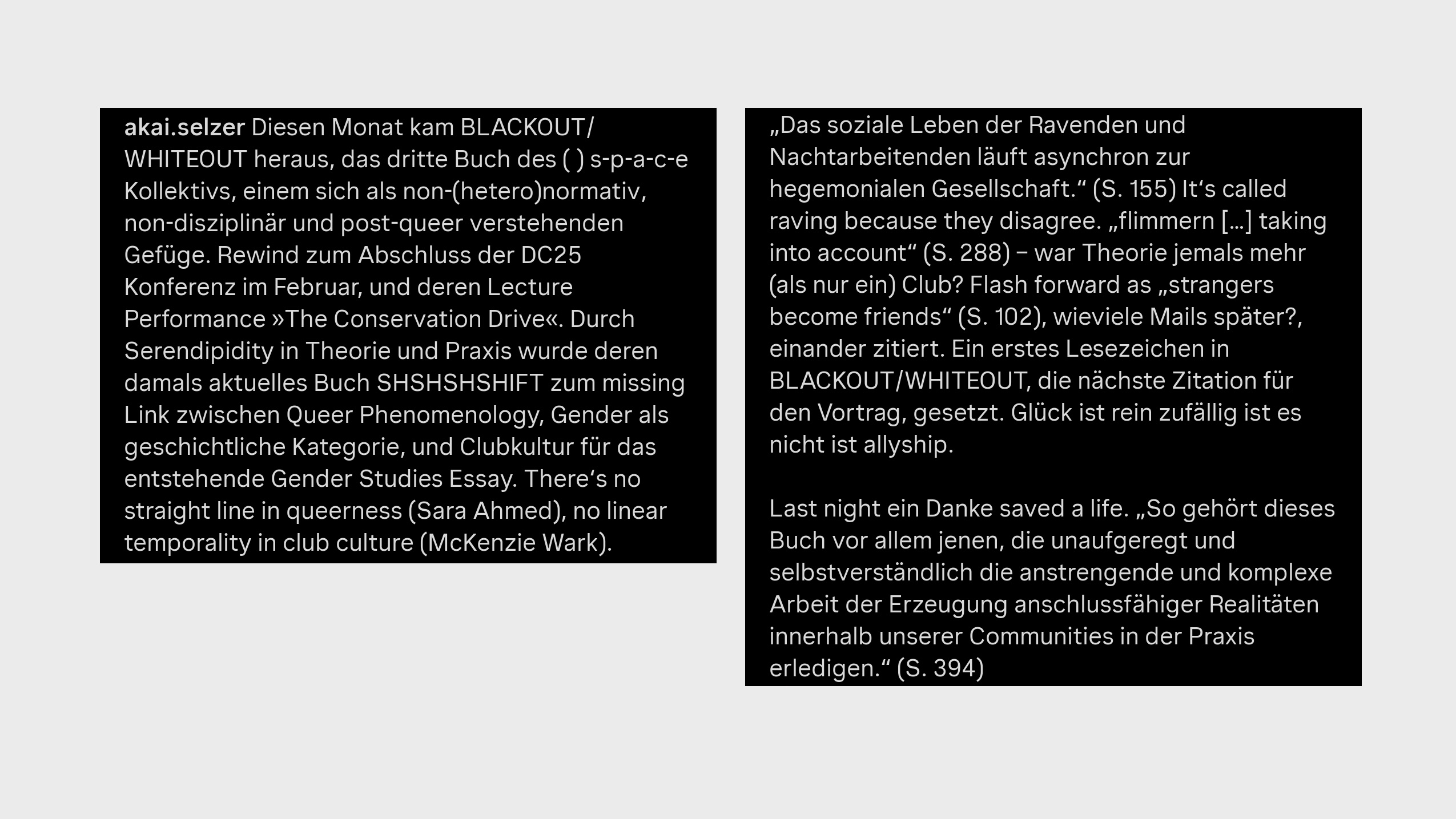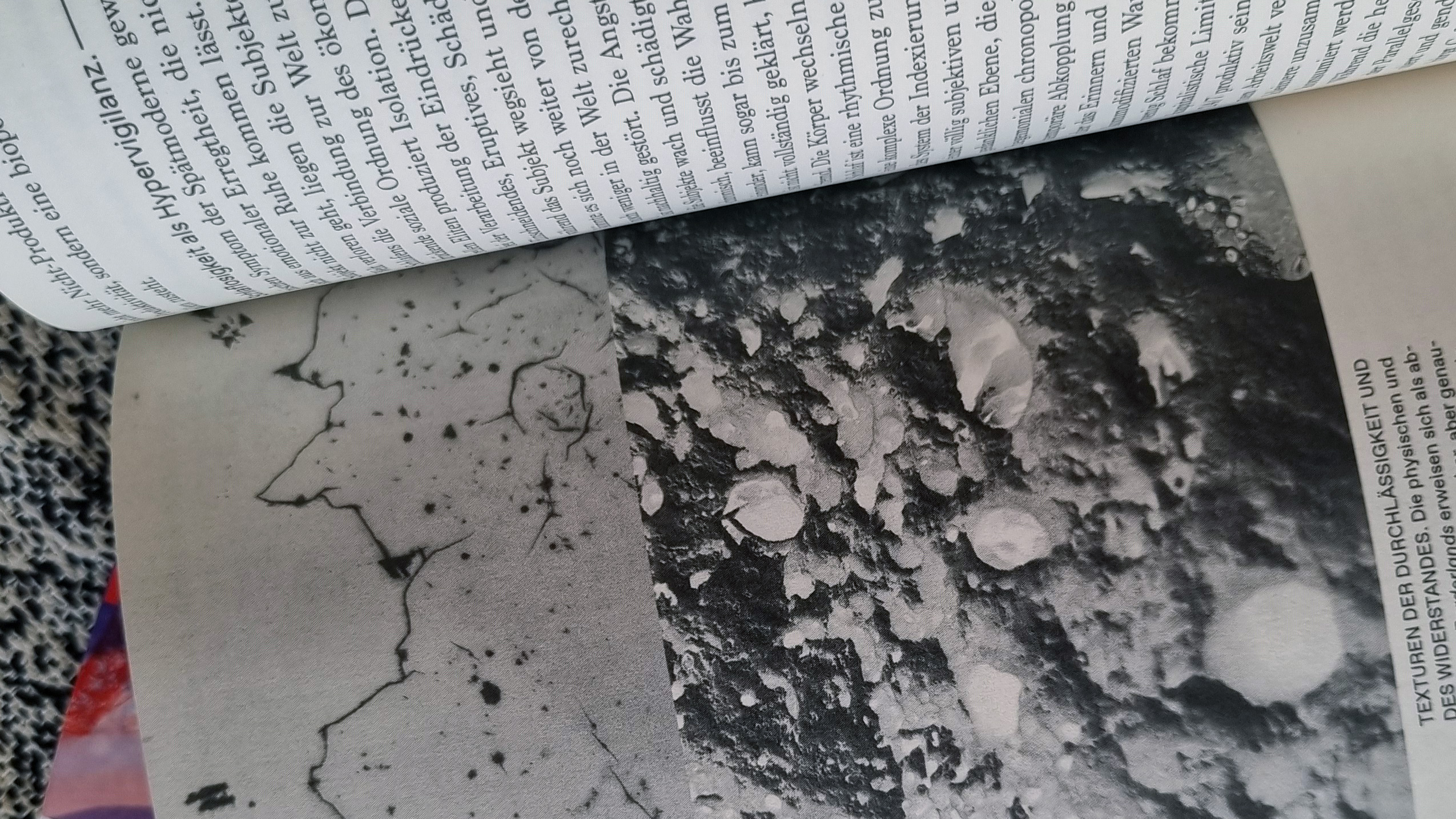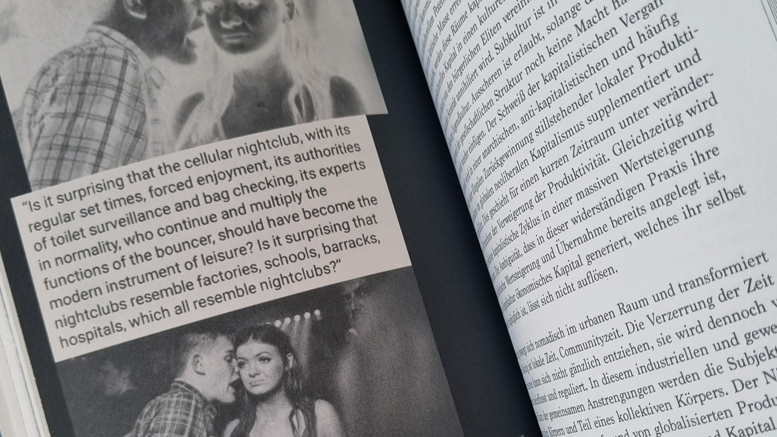(en) How to trace the ambiguous textures and texturings of one's own subjective, critical corporeality, which continually shifts within the monotonous beat, which repeats and reconfigures itself in the constant movement? How to inscribe oneself into a situational-collective bodily machinery determined by the vibrations of sound and stubbornly working on a desire for the alienated other? How to inscribe oneself into a reality that temporarily and situationally eludes the metastasizing communal body that calls itself society? The liminal practice of raving reveals itself less as a sociocultural counter-presentation of a temporarily self-sustaining intersubjective practice between self-forgetfulness and self-centeredness. Rather, it can be understood as an act of reassurance and refusal, between affirmation and loss of the subjective. It expands into the unspeakable, the irrational, and the strange in a deliberate and pleasurable distortion. The only possible way to move through these alien realities is with an open and broken heart.