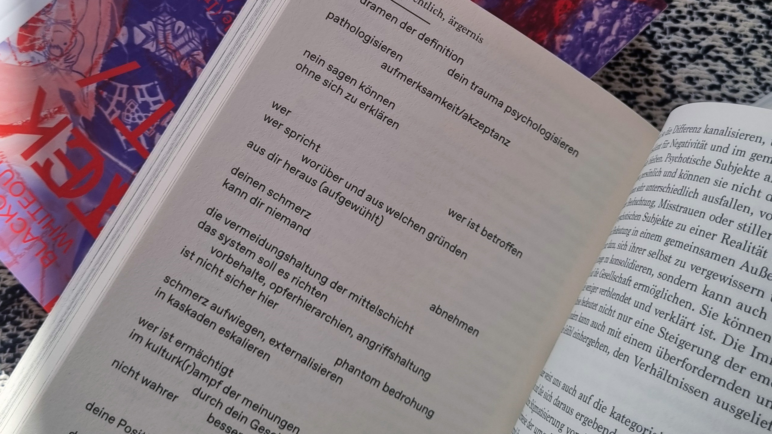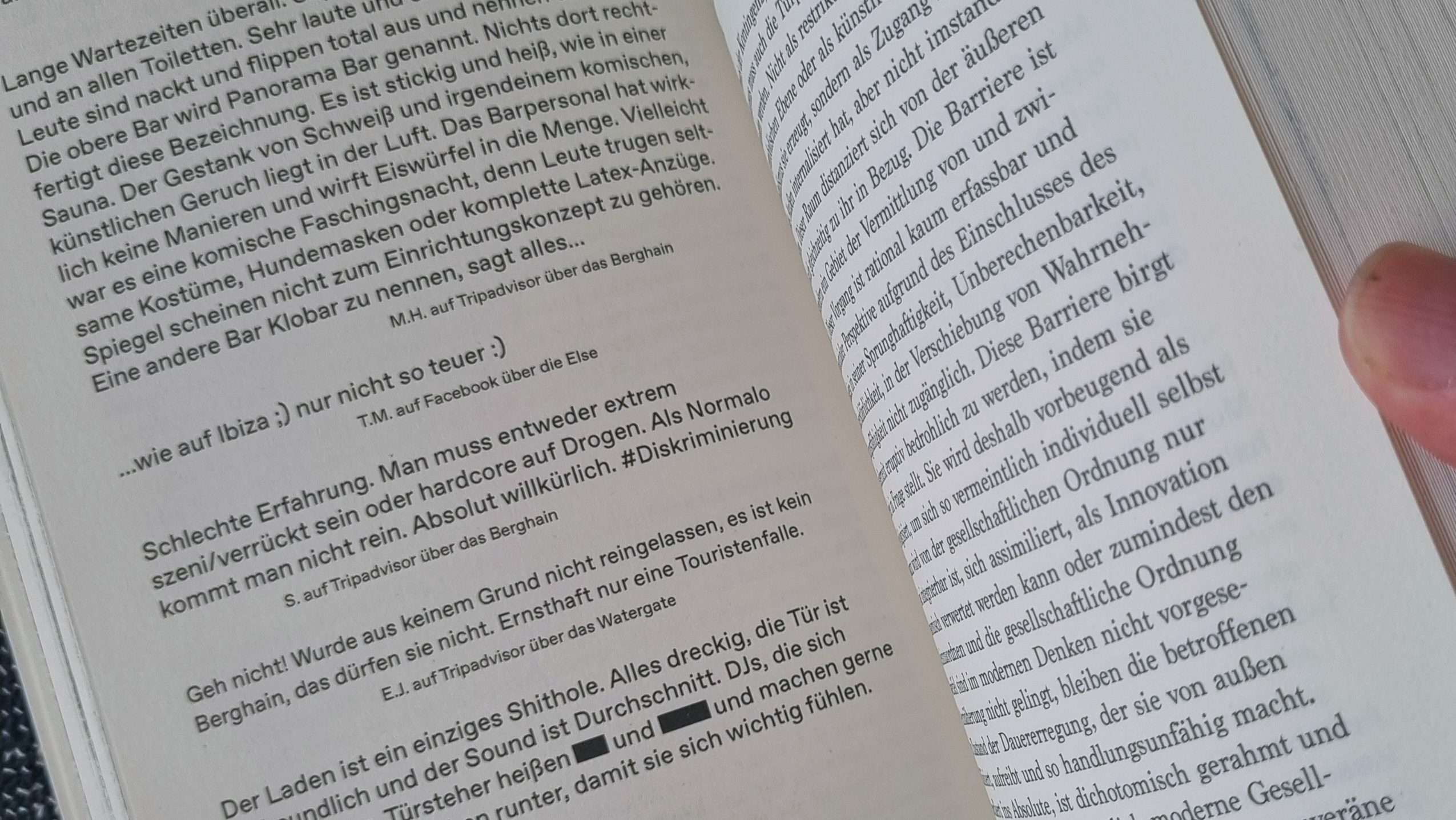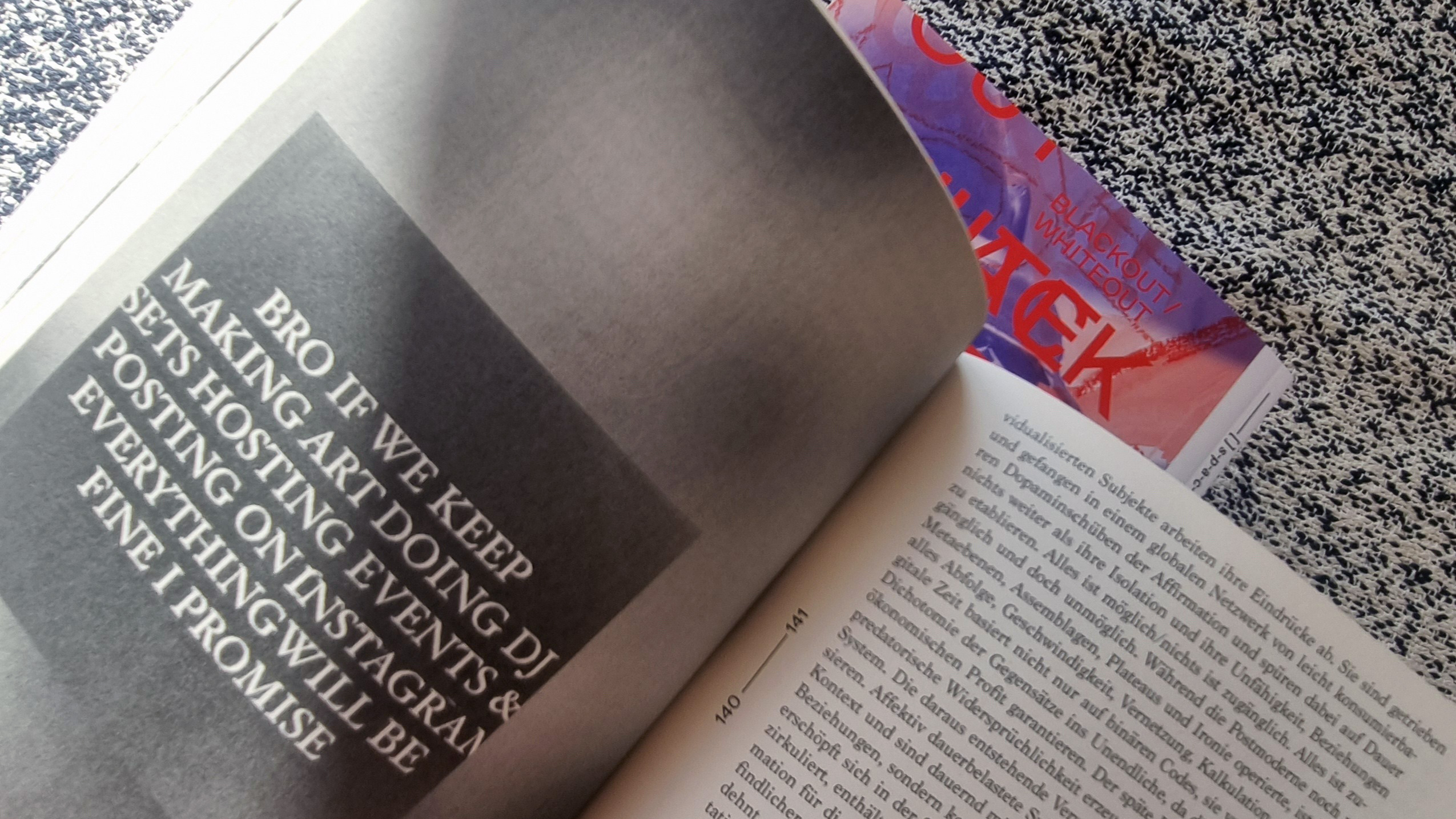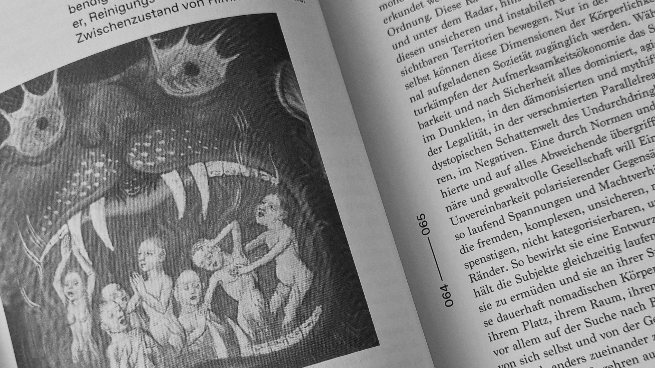 (en) How to trace the ambiguous textures and texturings of one's own subjective, critical corporeality, which continually shifts within the monotonous beat, which repeats and reconfigures itself in the constant movement? How to inscribe oneself into a situational-collective bodily machinery determined by the vibrations of sound and stubbornly working on a desire for the alienated other? How to inscribe oneself into a reality that temporarily and situationally eludes the metastasizing communal body that calls itself society? The liminal practice of raving reveals itself less as a sociocultural counter-presentation of a temporarily self-sustaining intersubjective practice between self-forgetfulness and self-centeredness. Rather, it can be understood as an act of reassurance and refusal, between affirmation and loss of the subjective. It expands into the unspeakable, the irrational, and the strange in a deliberate and pleasurable distortion. The only possible way to move through these alien realities is with an open and broken heart.