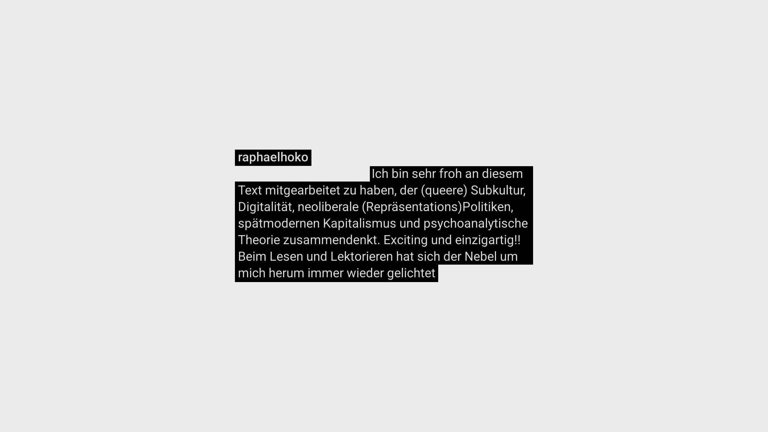 (de) Wie den ambiguen Texturen und Textierungen der eigenen subjektiven, kritischen Körperlichkeit nachspüren, die sich im monotonen Beat laufend verschiebt, die sich in der dauerhaften Bewegung wiederholen und rekonfigurieren? Wie sich einschreiben in eine situativ-kollektive Körpermaschinerie, die von den Vibrationen des Sounds bestimmt ist und sich störrisch an einem Begehren nach dem entfremdeten Anderen abarbeitet? Wie sich einschreiben in eine Realität, die sich dem metastasierenden Gemeinschaftskörper, der sich Gesellschaft nennt, temporär und situativ entzieht? Die liminale Praxis von Raving erschließt sich weniger als soziokulturelle Gegendarstellung einer sich temporär selbst erhaltenden intersubjektiven Praxis zwischen Selbstvergessenheit und -zentriertheit. Eher kann sie als Akt der Vergewisserung und Verweigerung zwischen Affirmation und Verlust des Subjektiven verstanden werden. Sie dehnt sich in einer absichtsvollen und lustvollen Verzerrung in das Unsagbare, Irrationale und Fremde aus. Der einzig mögliche Weg, uns durch diese uns fremden Realitäten zu bewegen, ist mit einem offenen und gebrochenen Herzen.