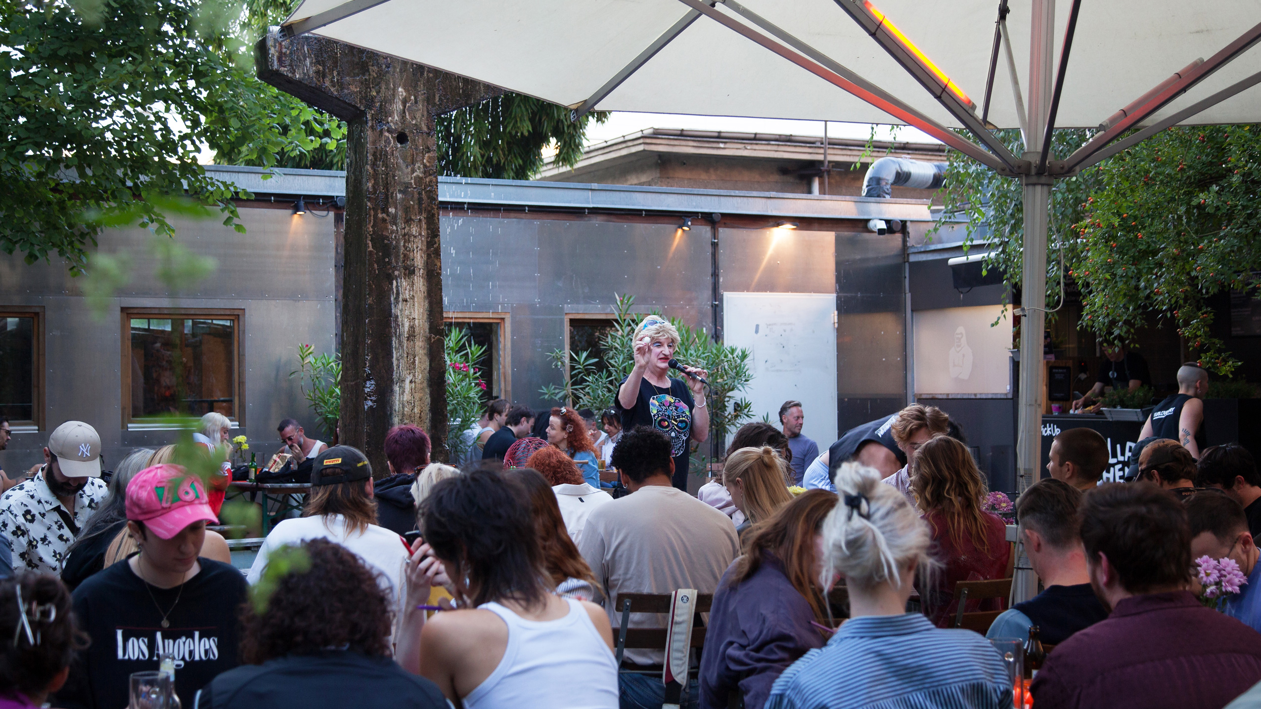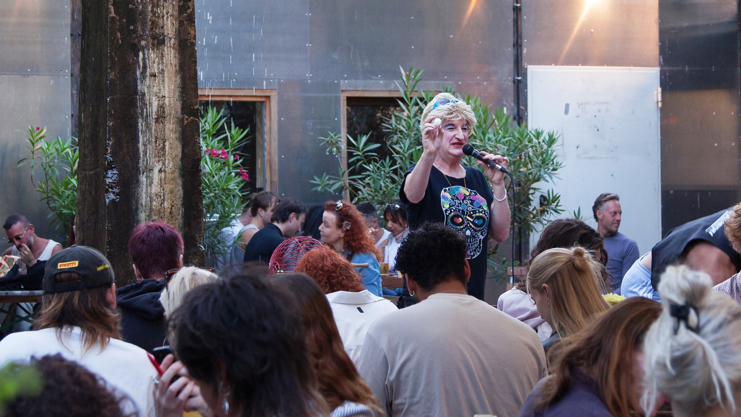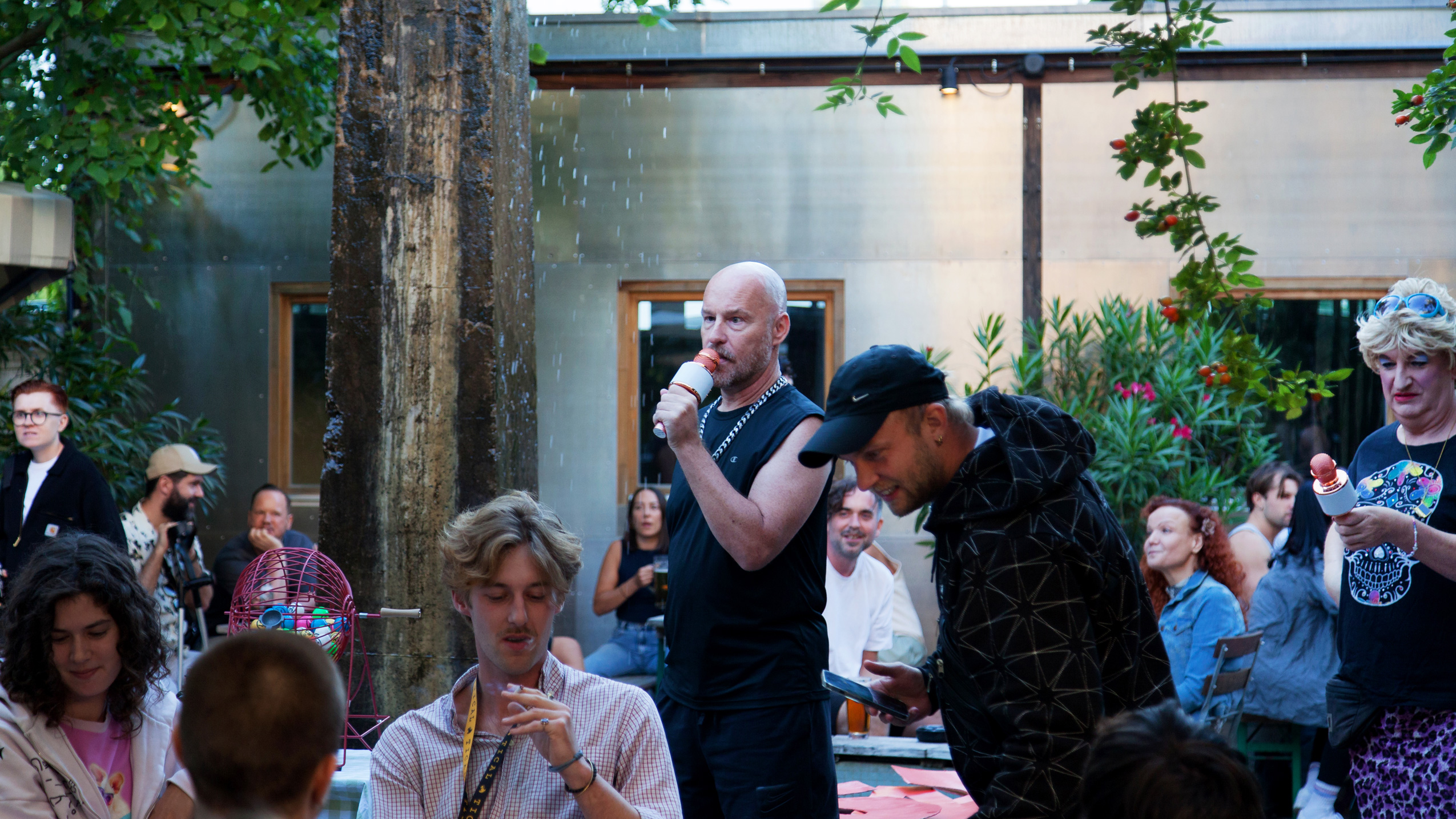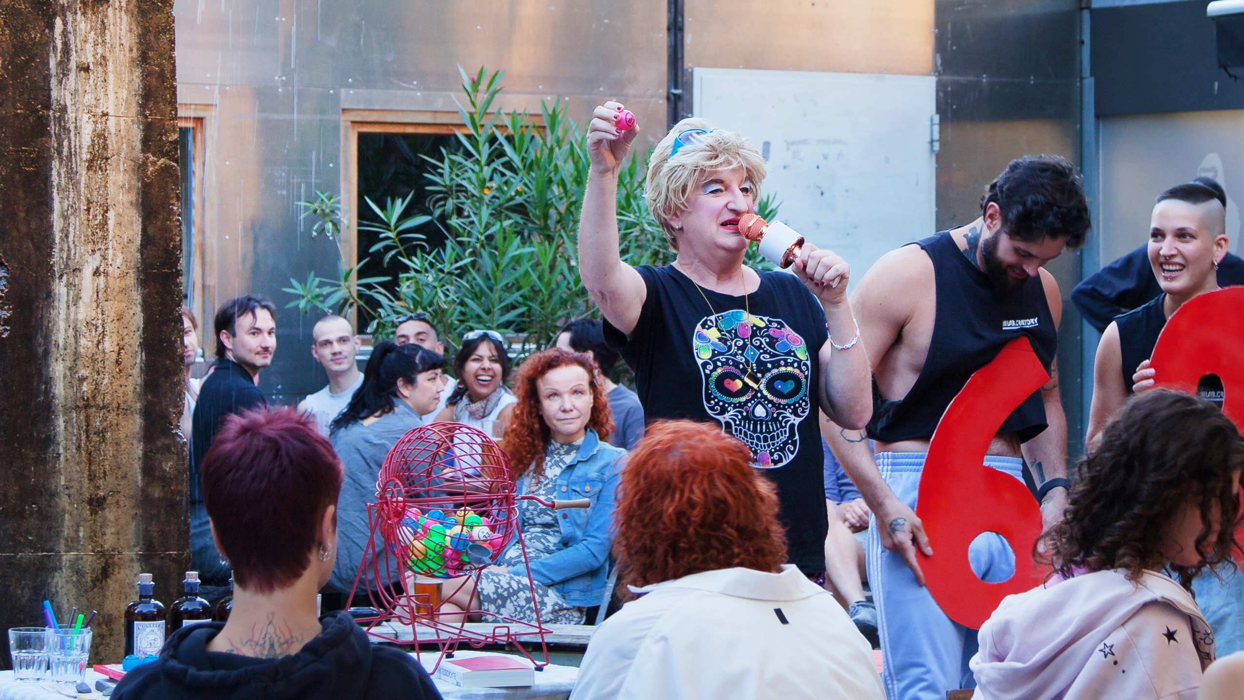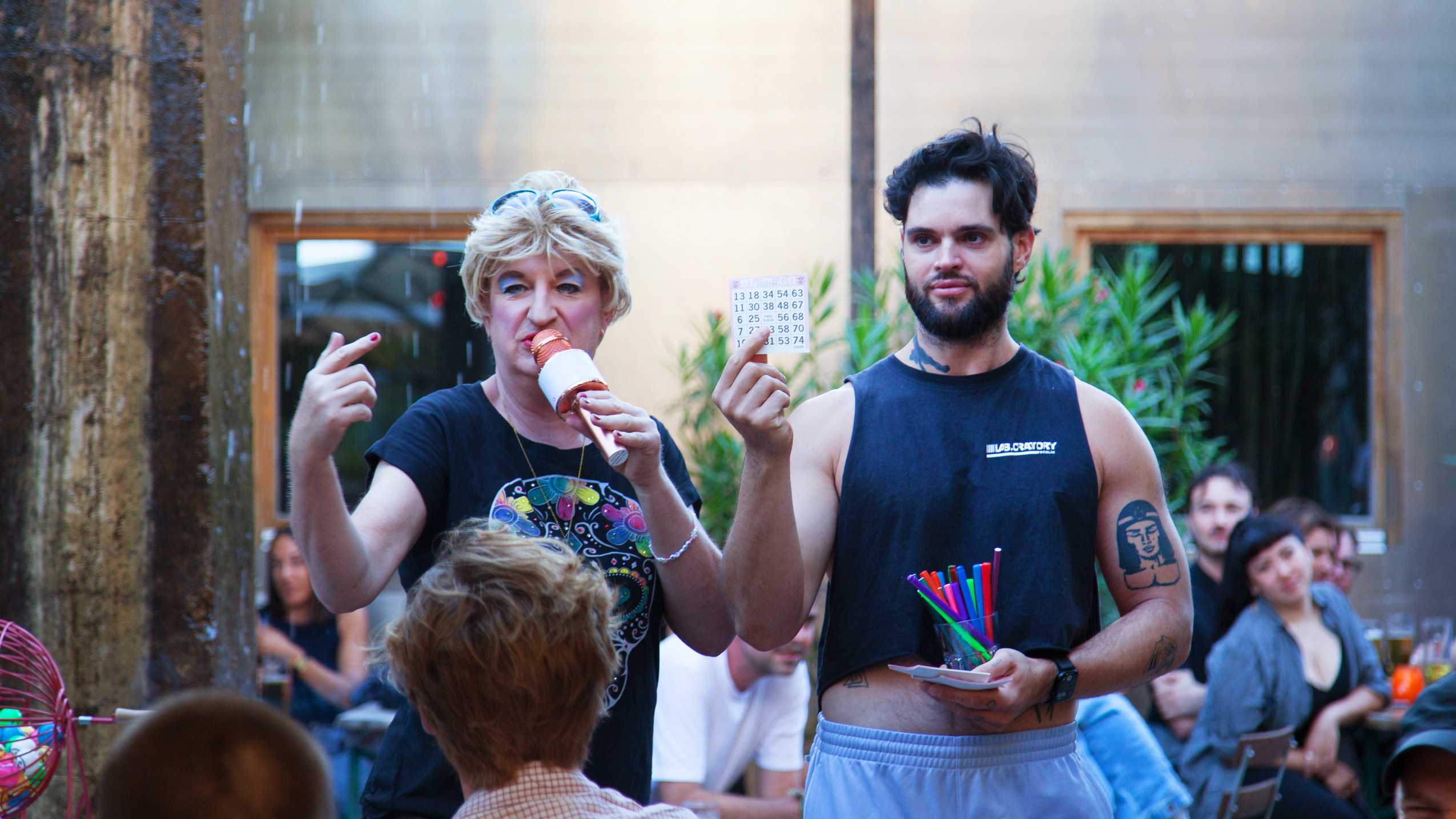 (en) To celebrate the release of SHSHSHSHIFT we renounced to do a book presentation, in favour of offering a space of belonging for the community of club workers, regulars and friends. In many private conversations and public events we noticed that there was a need to come together, talk about work experiences, exchange and pass on knowledge. Institutionalized formats such as workshops or panels reach very few people. We wanted to create an irregular regulars' table where we open up space for different topics and inputs that come from the communities themselves. The framework is not intended to be educational, but rather to stimulate conversations in an intimate setting. A club worker bingo seemed like a good opportunity to celebrate the old Lady Berlin club culture in an ironic way. Hosts have been performance artist HURRICANE Alexander and Edith Schröder, a Berlin travesty icon, assisted by the BINGO HIMBOS, all also passionate club workers. The presentation of BLACKOUT / WHITEOUT at Bierhof Rüdersdorf escalated to a chaotic happening (see pictures). The Clubworker Community Bingo will take place regularly with the support of it's crew in the summer season 2026 with changing special guest appearances.