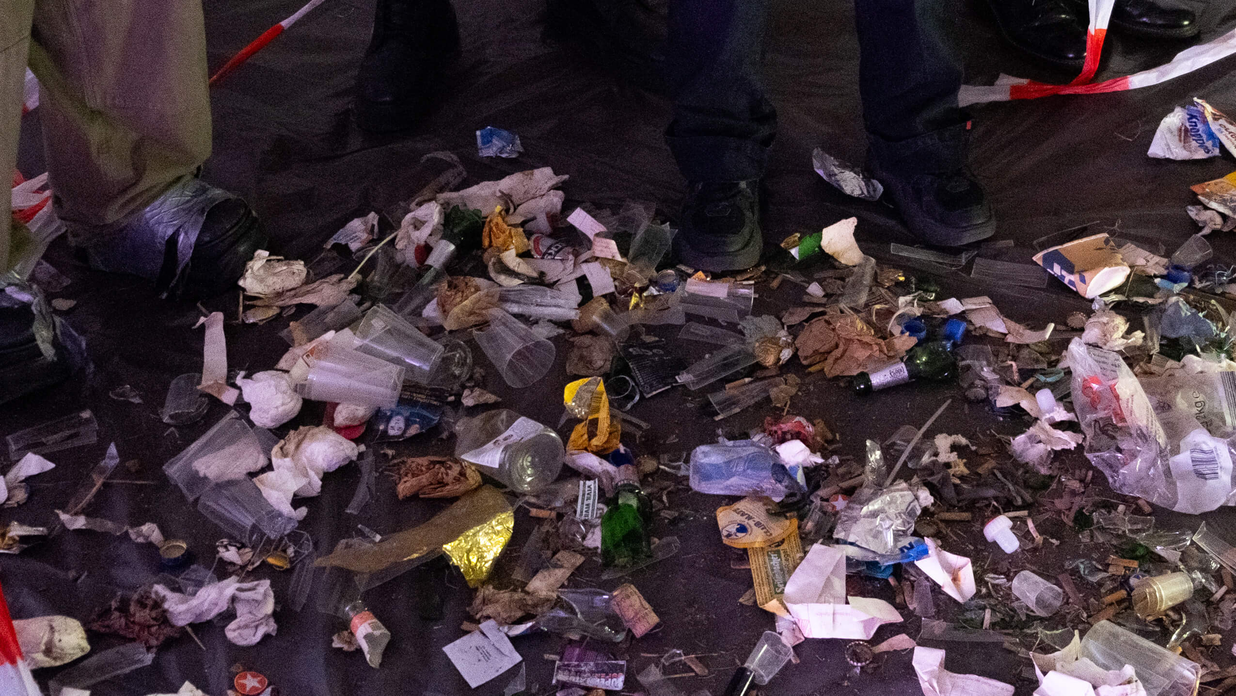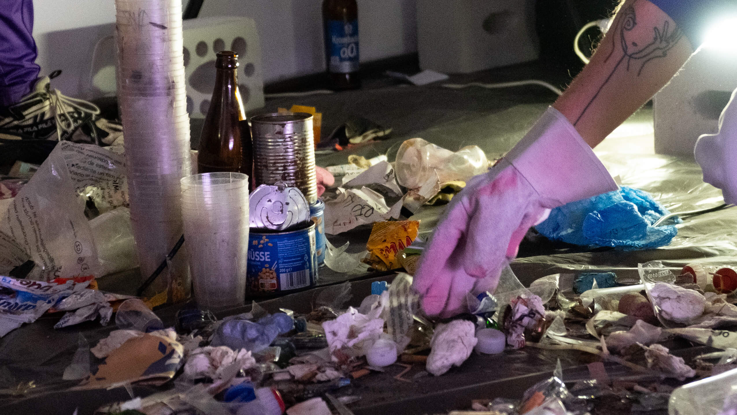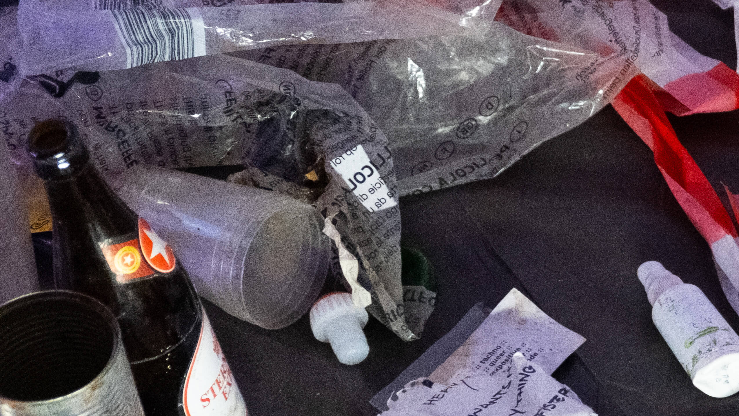 THE ARCHIVE. A pile of garbage, collected after an illegal queer rave, is spread out in front of the audience, displayed as a material remnant of the rave. A relic that reveals nothing of the rave experience itself, no memories of the night. Together with the audience, these worthless traces will be analyzed, ordered, and categorized in a collective exploration process, negotiating the representation of queer subculture through systemic and hegemonic techniques of archiving and appropriation. By questioning the very concept of the archive as a source of information, we propose a subjective perspective, one of disorder, dirt, confusion, triviality, perversion, fluidity. A shift in focus toward the incomprehensible and priceless, the unknown and uncanny, and the failure of learned patterns.