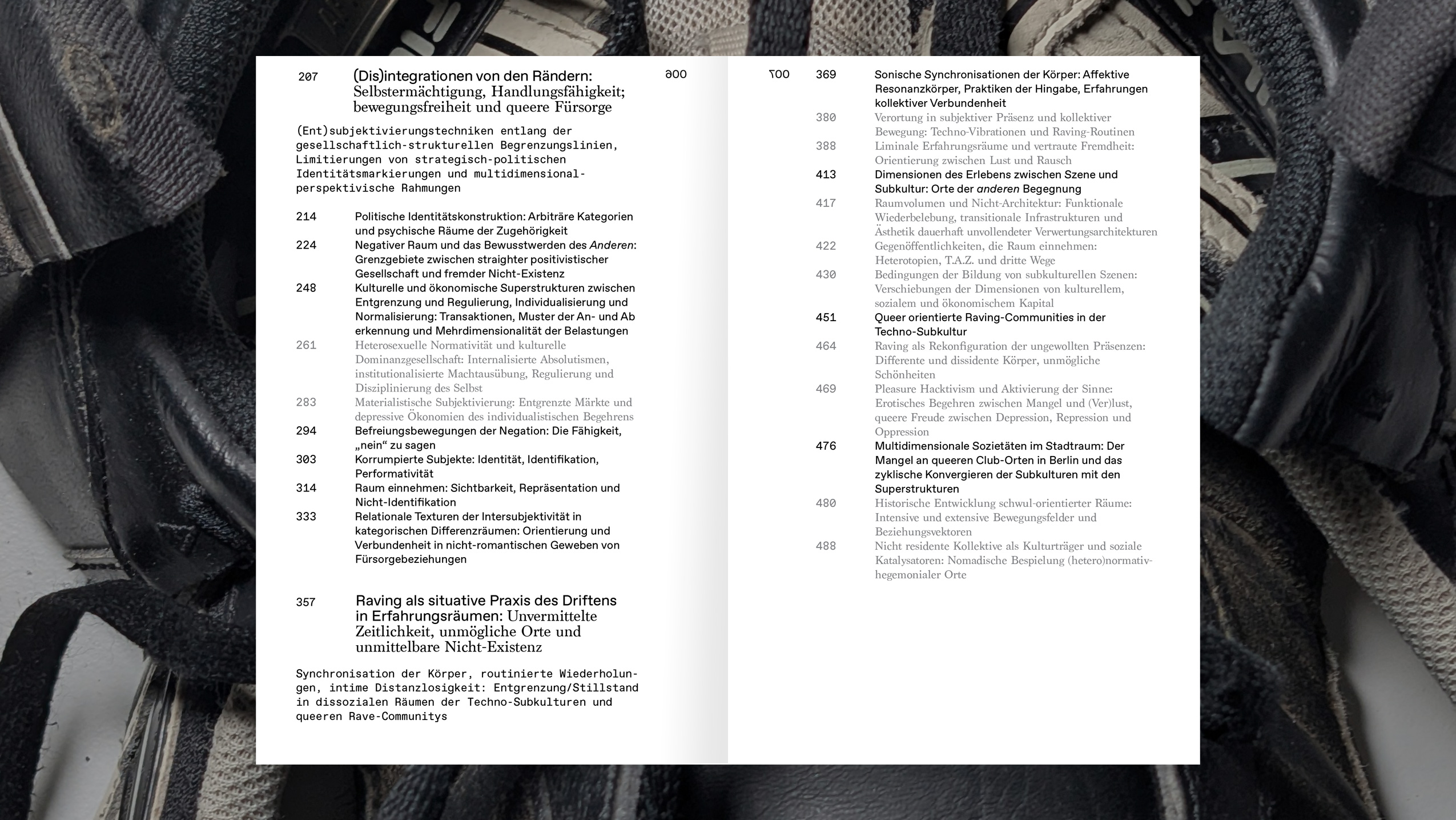 (de) Die hegemoniale und techno-subkulturelle Gegenwart Berlins ergibt sich aus einer Nachwende-Narration der Vereinigung heraus, die sich in wiederholten Kumulationen von außergewöhnlichen Umständen, in wechselnden (macht)politischen Verhältnissen und demografischen Verschiebungen ereignet. Ein urbaner Körper in Bewegung zwischen Stabilität und Instabilität, der sich immer wieder de-/rekonstruiert, kollabiert und sich konstitutioniert. Ein Raum der gesellschaftlichen, kulturellen, ökonomischen und symbolischen Brüche und Übergänge, in zyklischen Wiederholungen aus unterschiedlichen Perspektiven umworben, eingenommen, abgelehnt, vereinnahmt, besetzt, umgedeutet, überschrieben. Politisch geht es darum, dem straighten Denken der heteronormativen Hegemonialität folgend, Mehrheiten durch Ausschluss von Minderheiten zu bilden, während sich die Realitäten von Raving der Differenz zum Anderen bewusst/unterbewusst, nach innen/außen öffnen. Jede Erschütterung sensibilisiert das Bewusstsein, fördert Selbstregulierung, Intersubjektivität und Resilienz. Jede Verschiebung wirkt subjektiv/kollektiv, lokal/global, irl/online. Performative Handlungen und repräsentatives Image hingegen verpuffen aktionistisch und münden in eine weitere individualistische Beschleunigung der Verhältnisse.