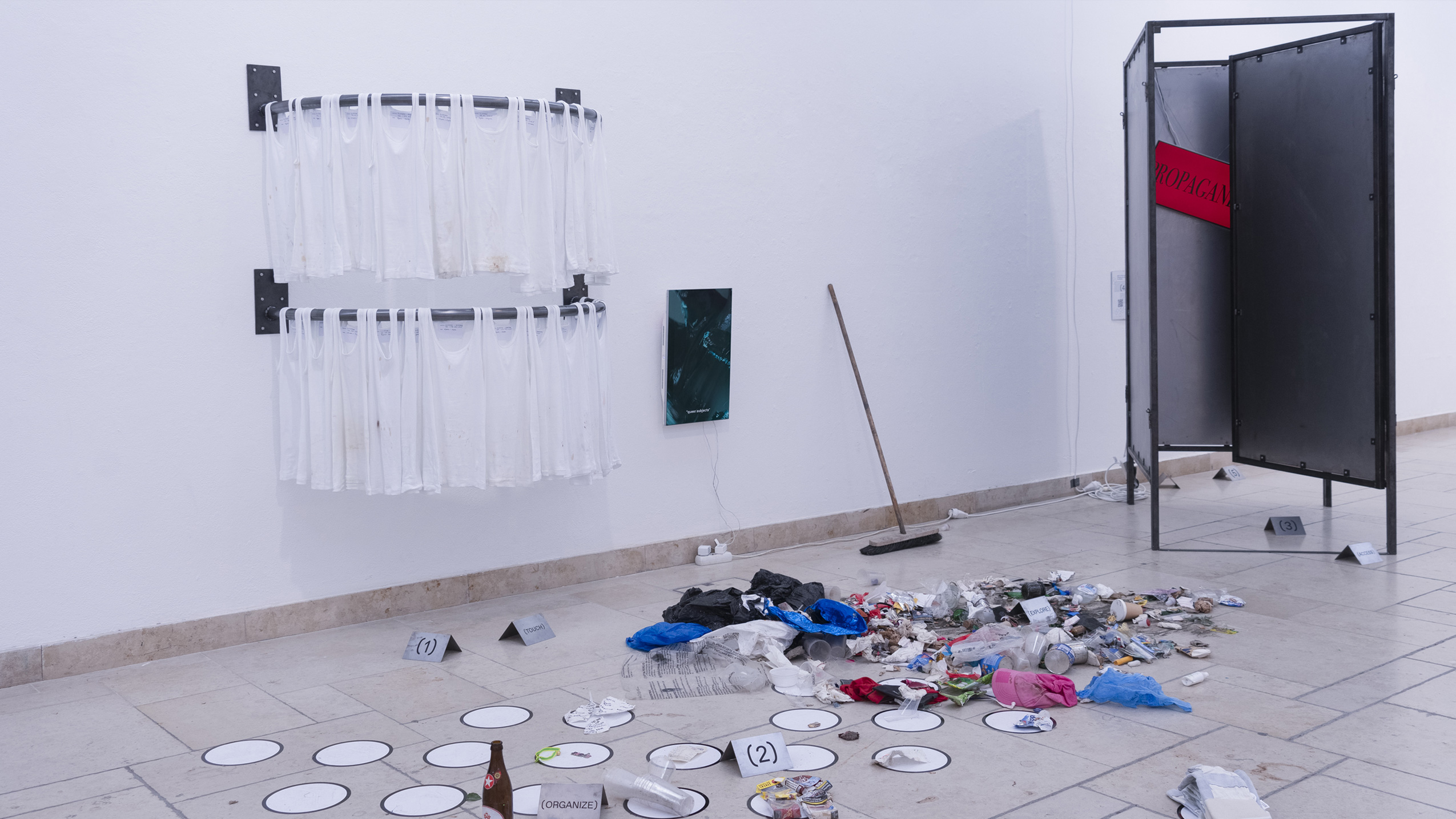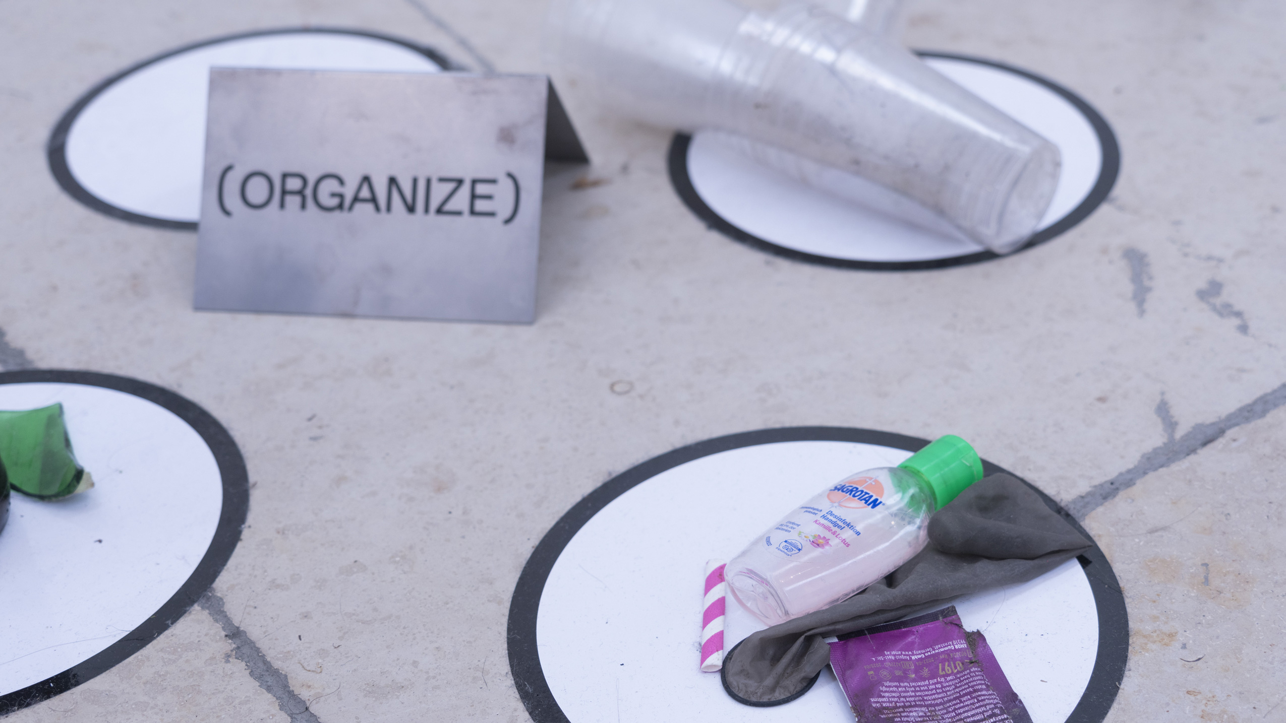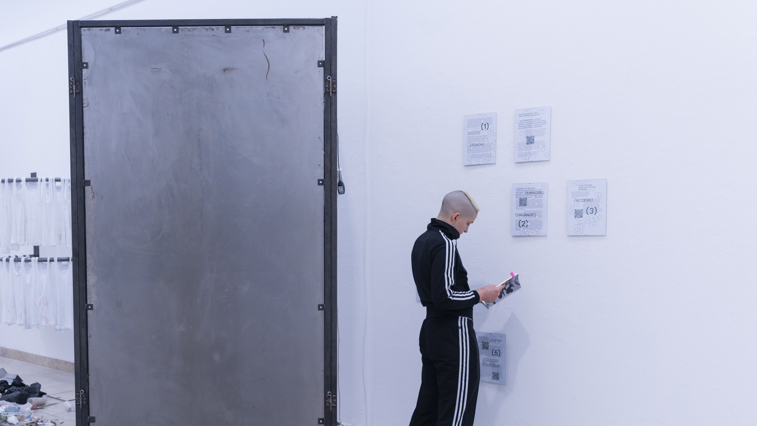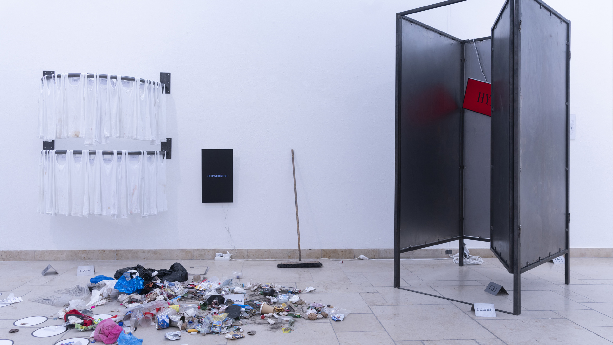 (NOTE: Die Sicherheitsbeauftragten der Universität der Künste Berlin wollten die Installation zunächst nicht zulassen. Nachdem sie darauf hingewiesen wurden, dass es sich bei dem Müll um Überreste einer queeren Cruising-Party handelte, verwiesen sie auf ein erhöhtes Verletzungs- und Infektionsrisiko.)