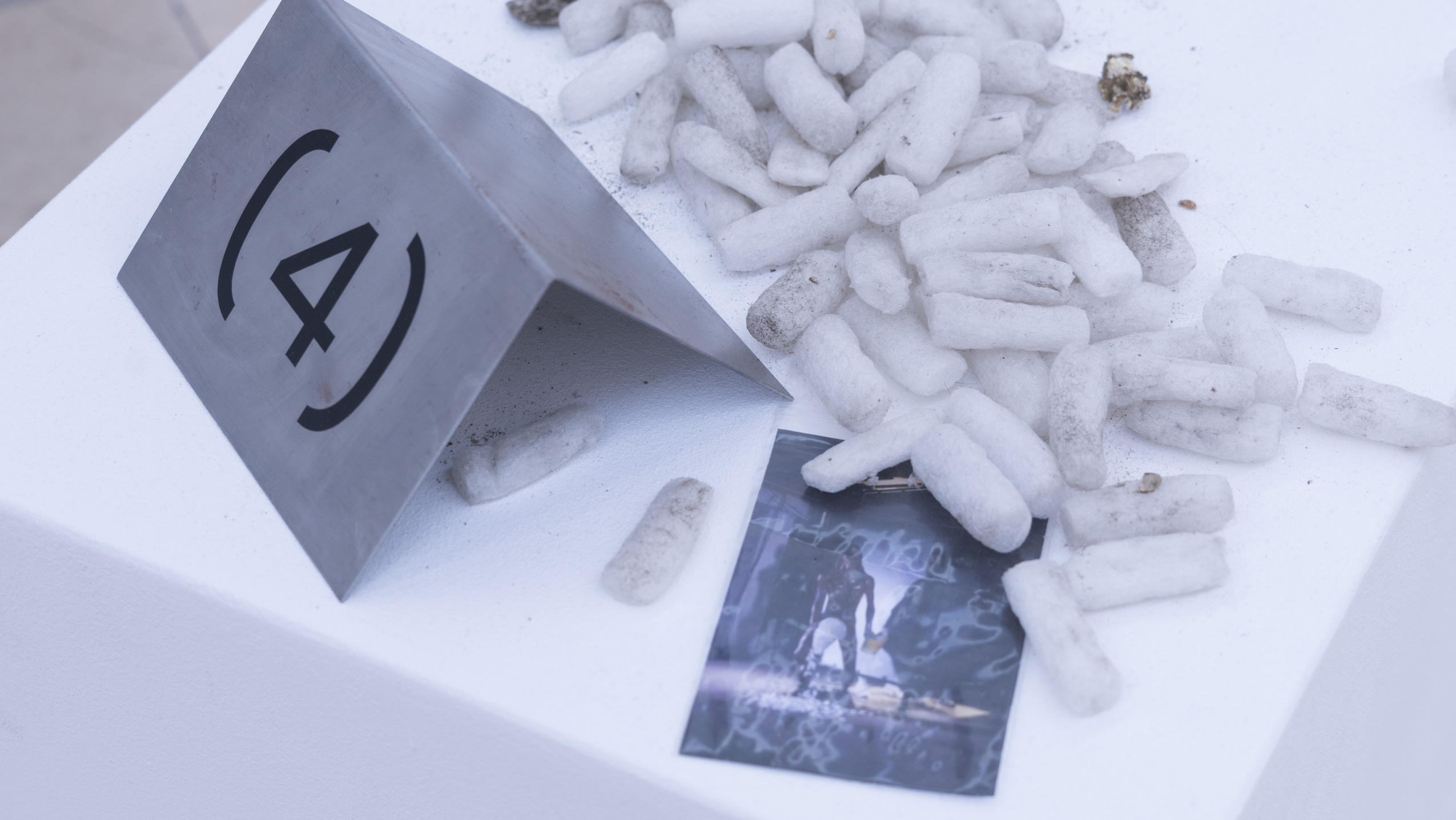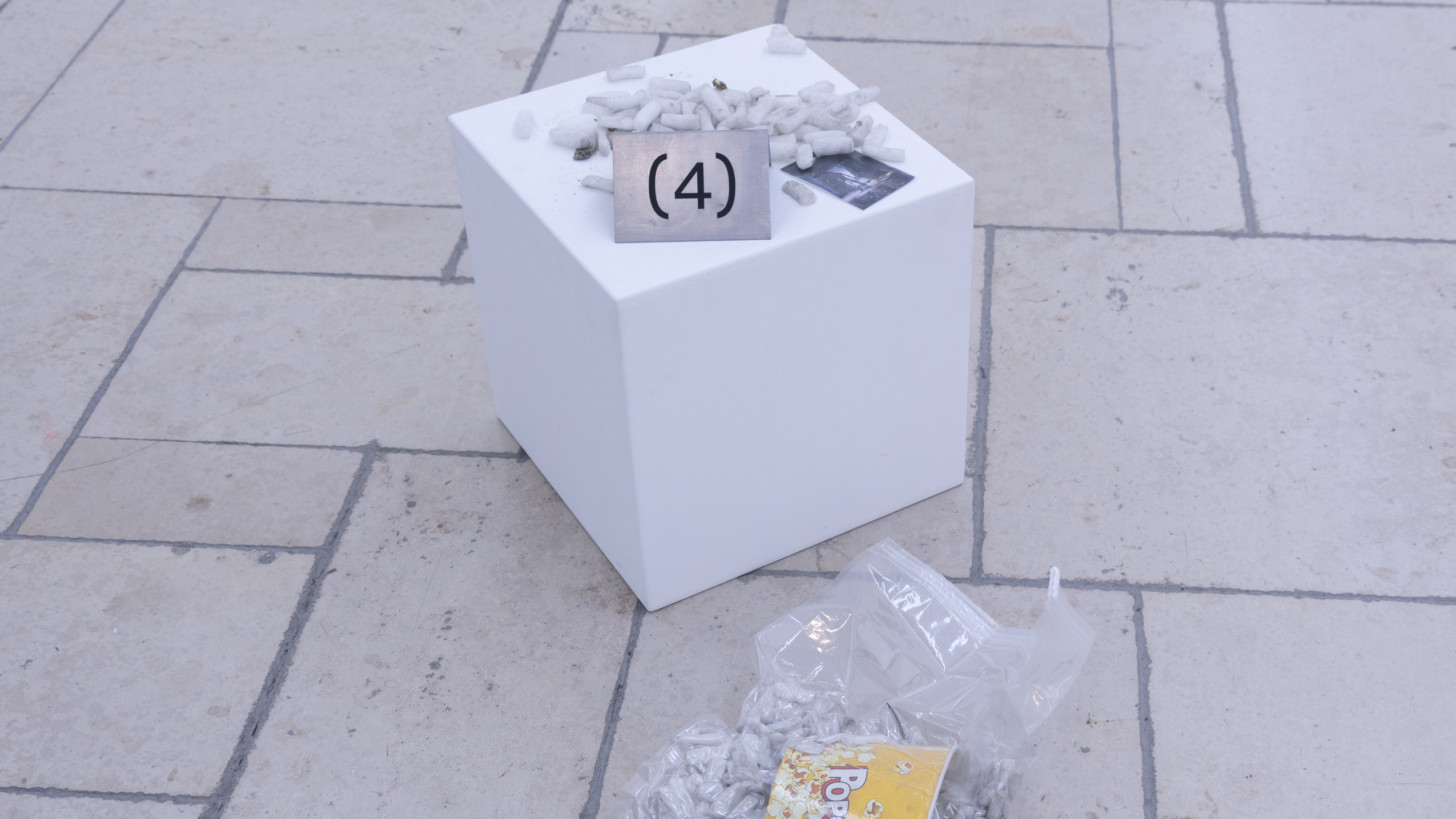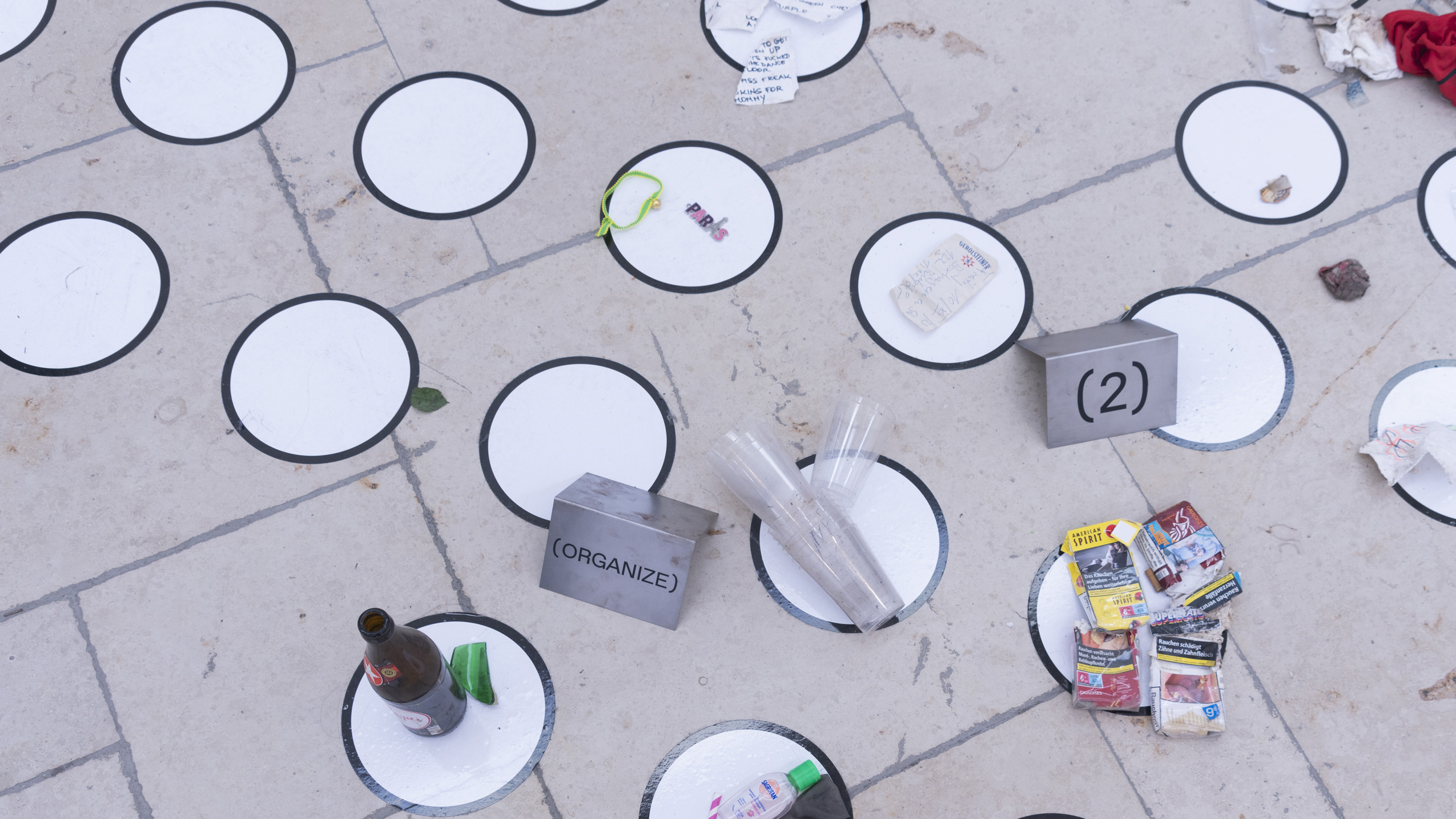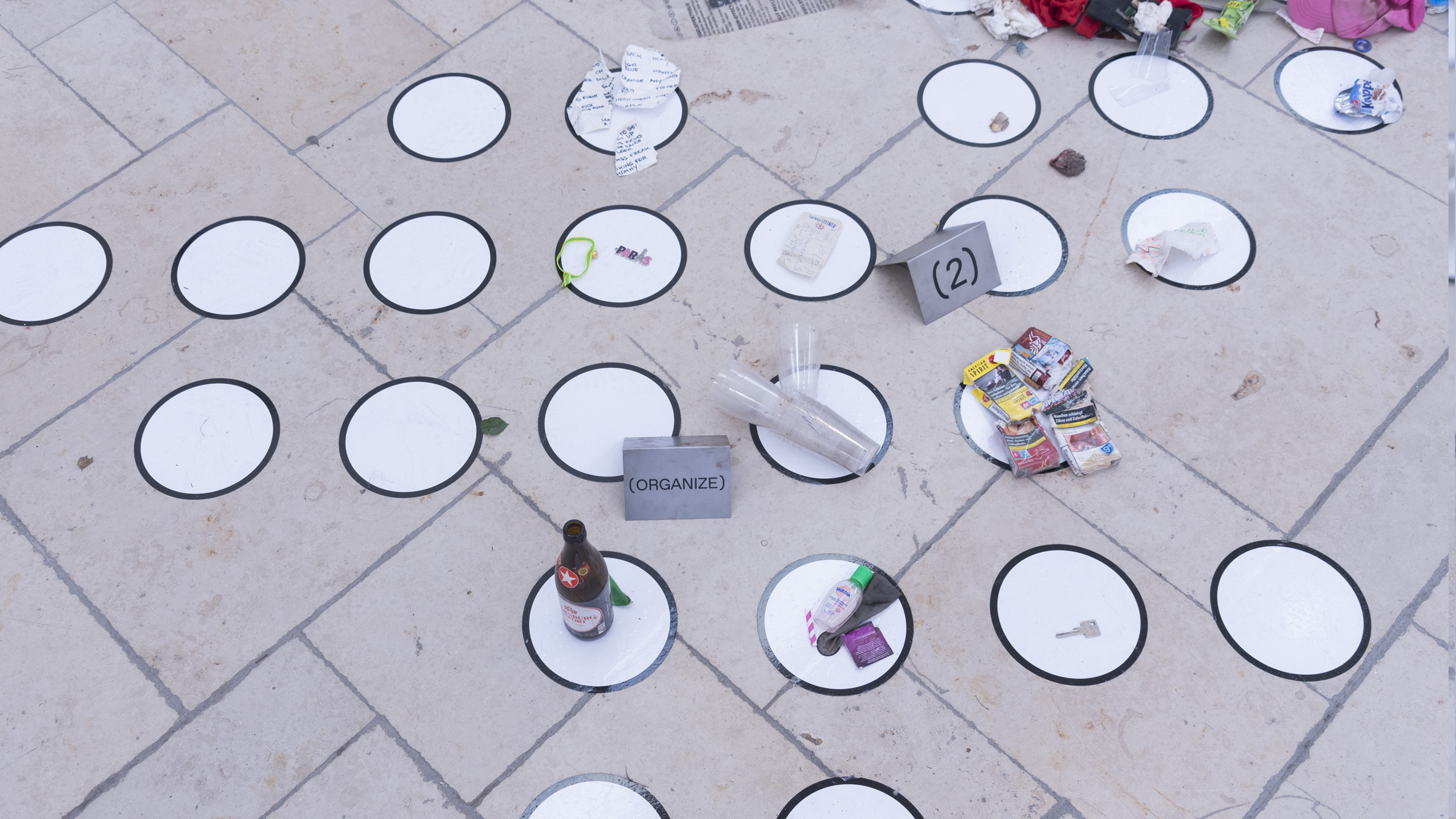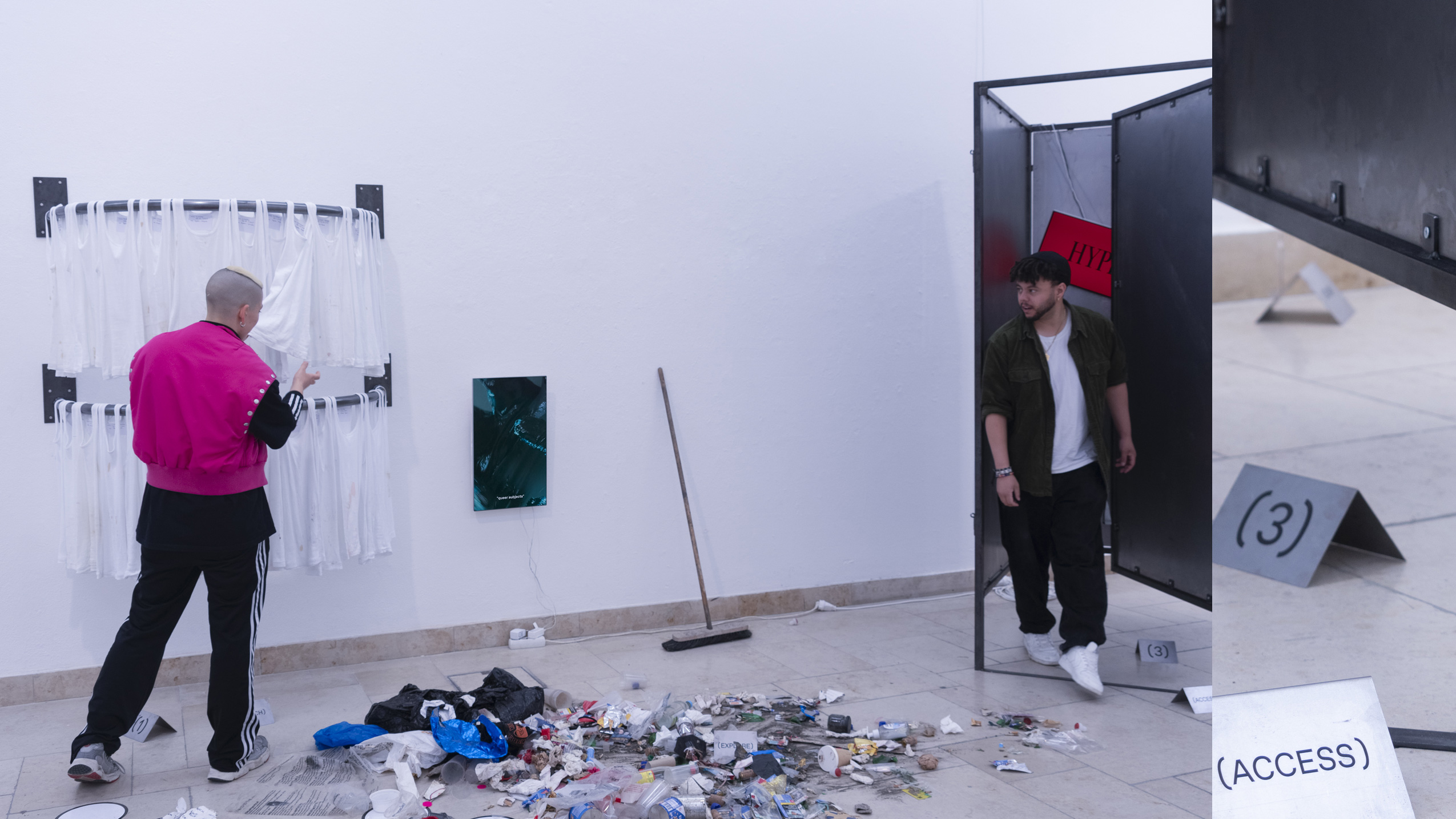 (NOTE: Die Sicherheitsbeauftragten der Universität der Künste Berlin wollten die Installation zunächst nicht zulassen. Nachdem sie darauf hingewiesen wurden, dass es sich bei dem Müll um Überreste einer queeren Cruising-Party handelte, verwiesen sie auf ein erhöhtes Verletzungs- und Infektionsrisiko.)