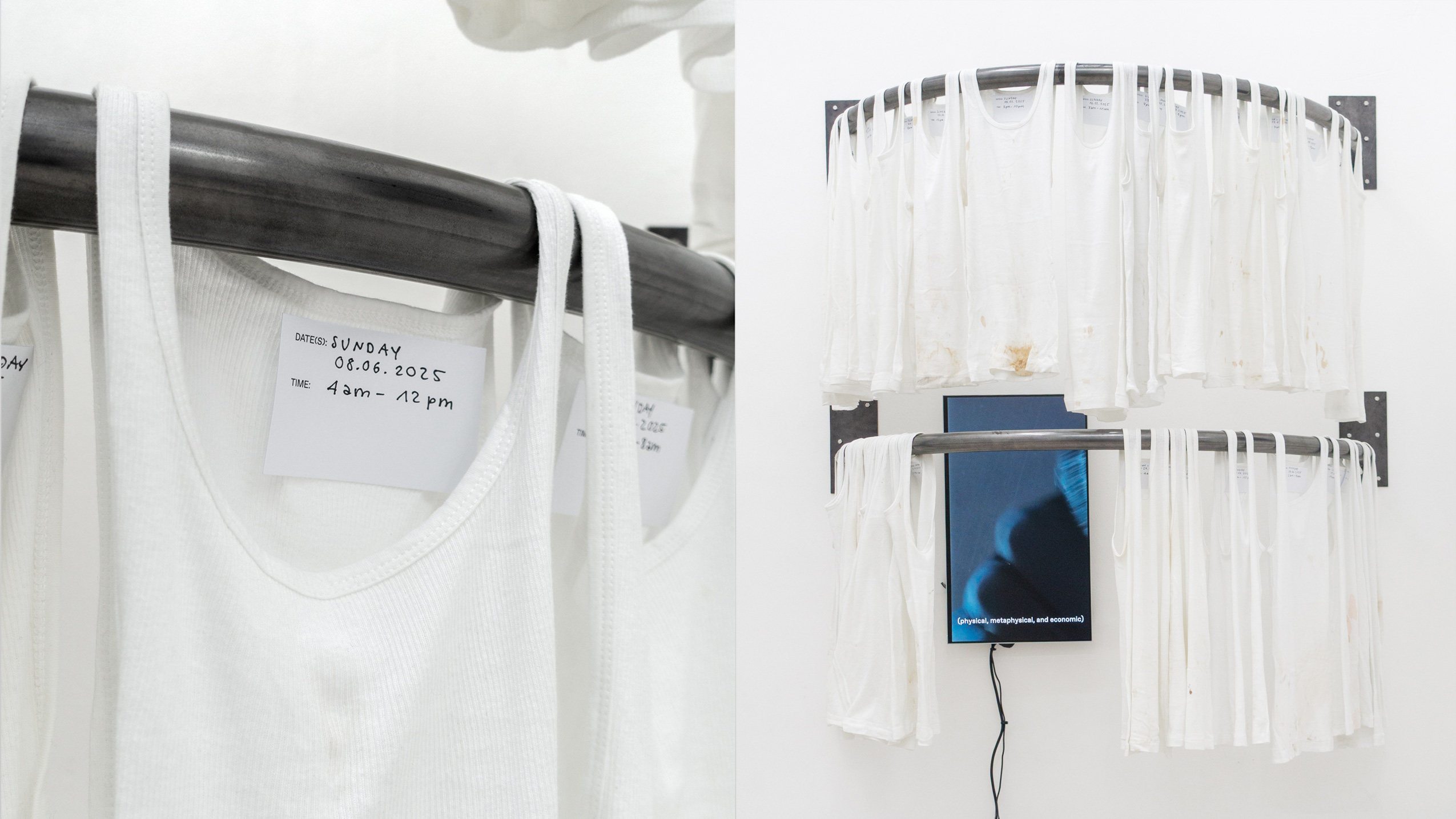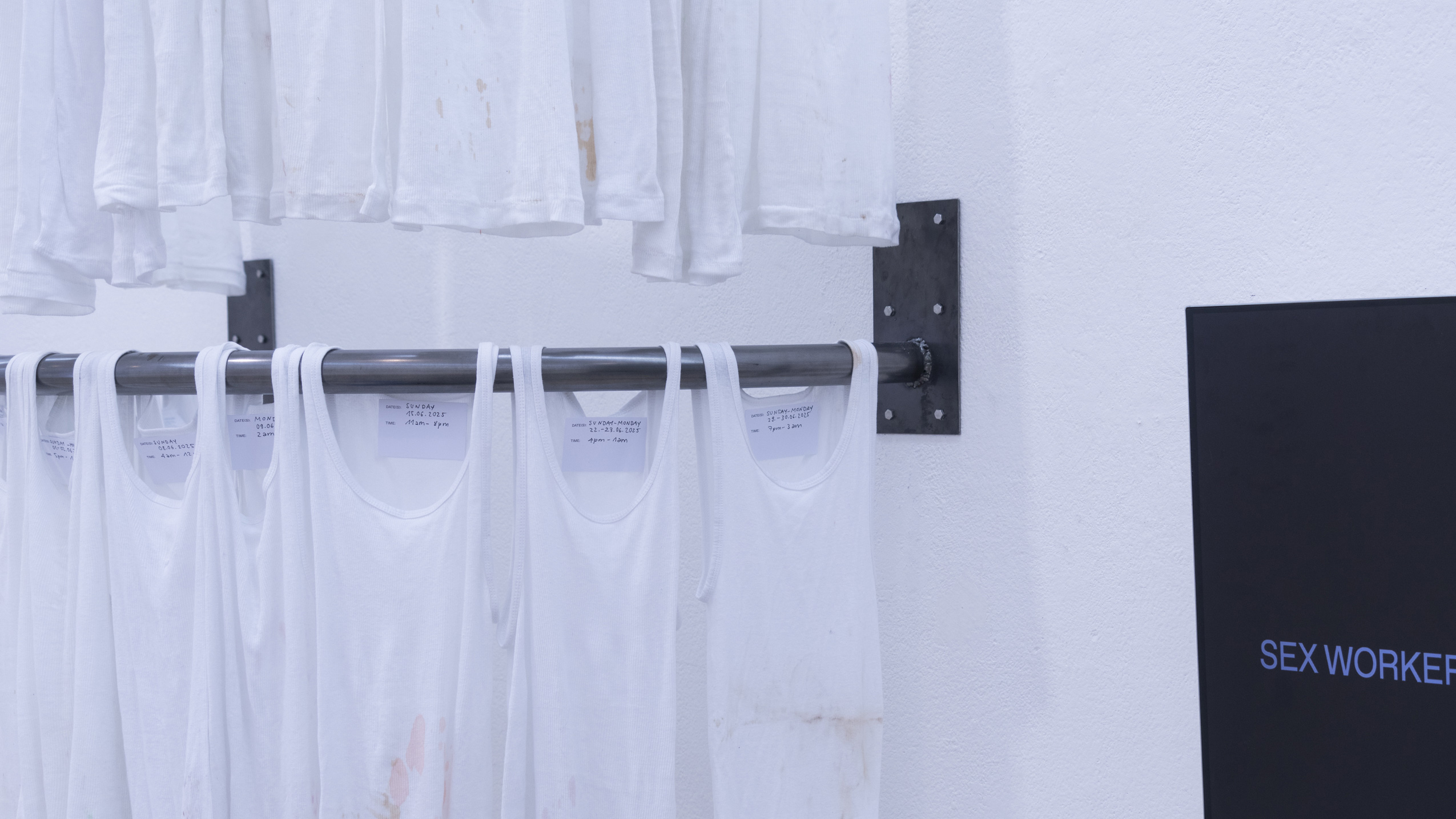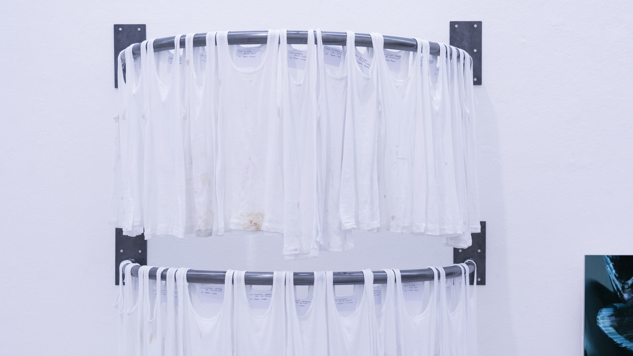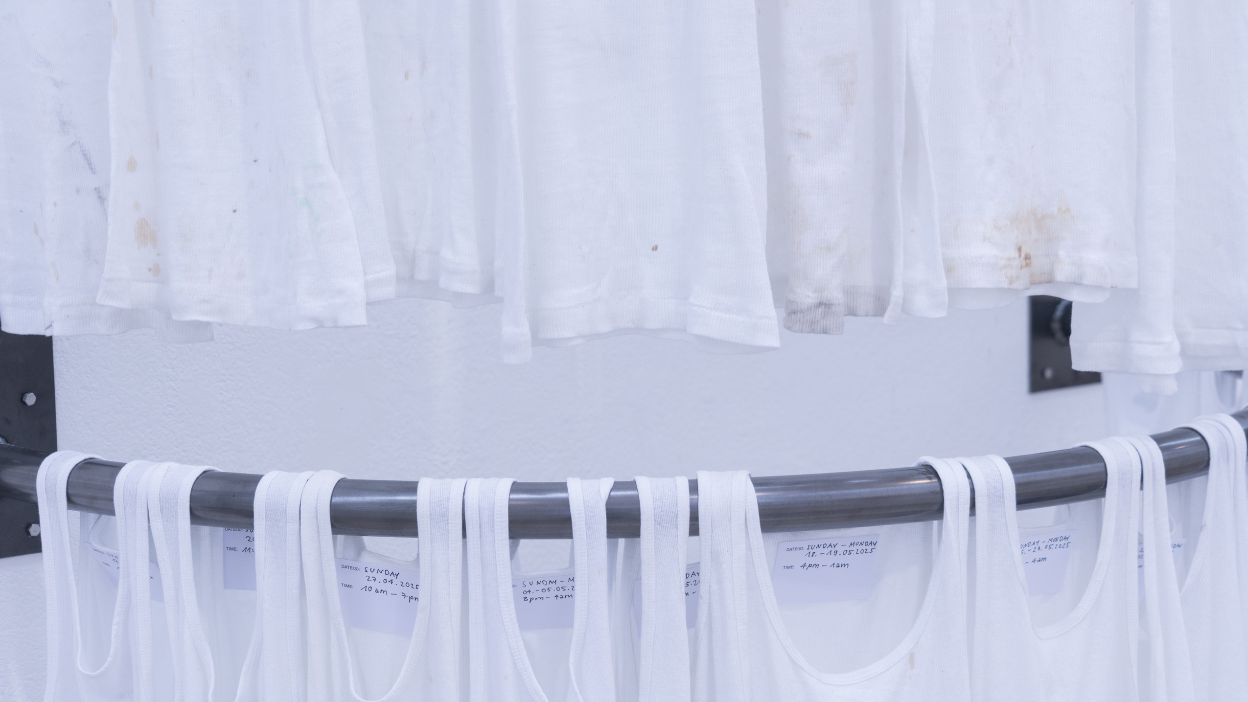 (en) SUNDAY/MONDAY collects 27 standardized, white tank tops (colloquially referred to as wifebeaters) that were worn while working as a bartender at a club. The shifts took place on Sunday and/or Monday, colliding with the temporality and structuring of the week as determined by hegemonic society. The tank tops were collected and archived over a span of six months, between January and June 2025. Each one bears the traces of physical labor, the signs of wear from a shift: dirt, stains, and drink residues on the outside mix with sweat from the inside. They form a personal cartography of subcultural labor and show, in the cultural context, an aestheticized image—another failed attempt at archiving and approaching the raving experience.