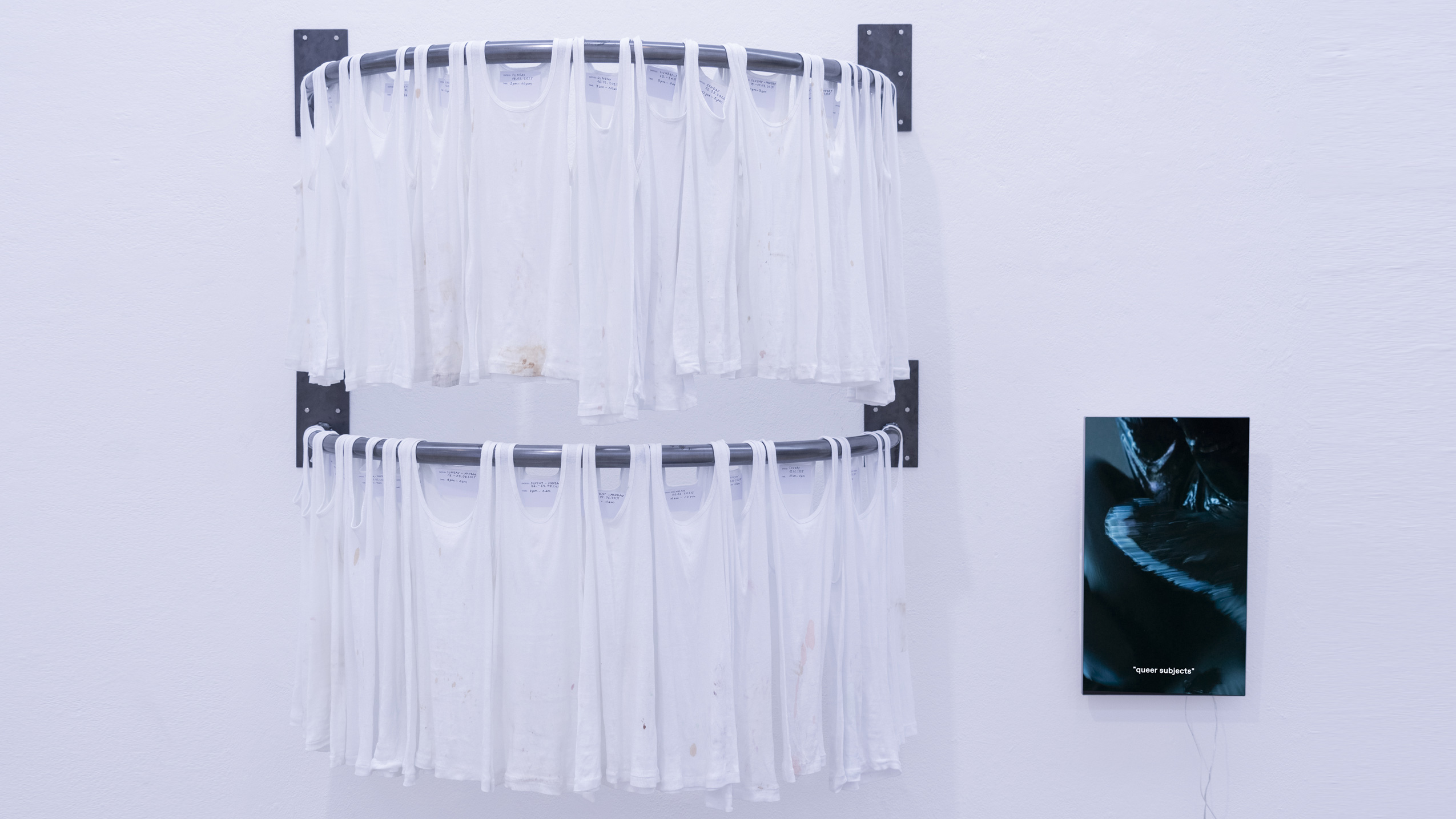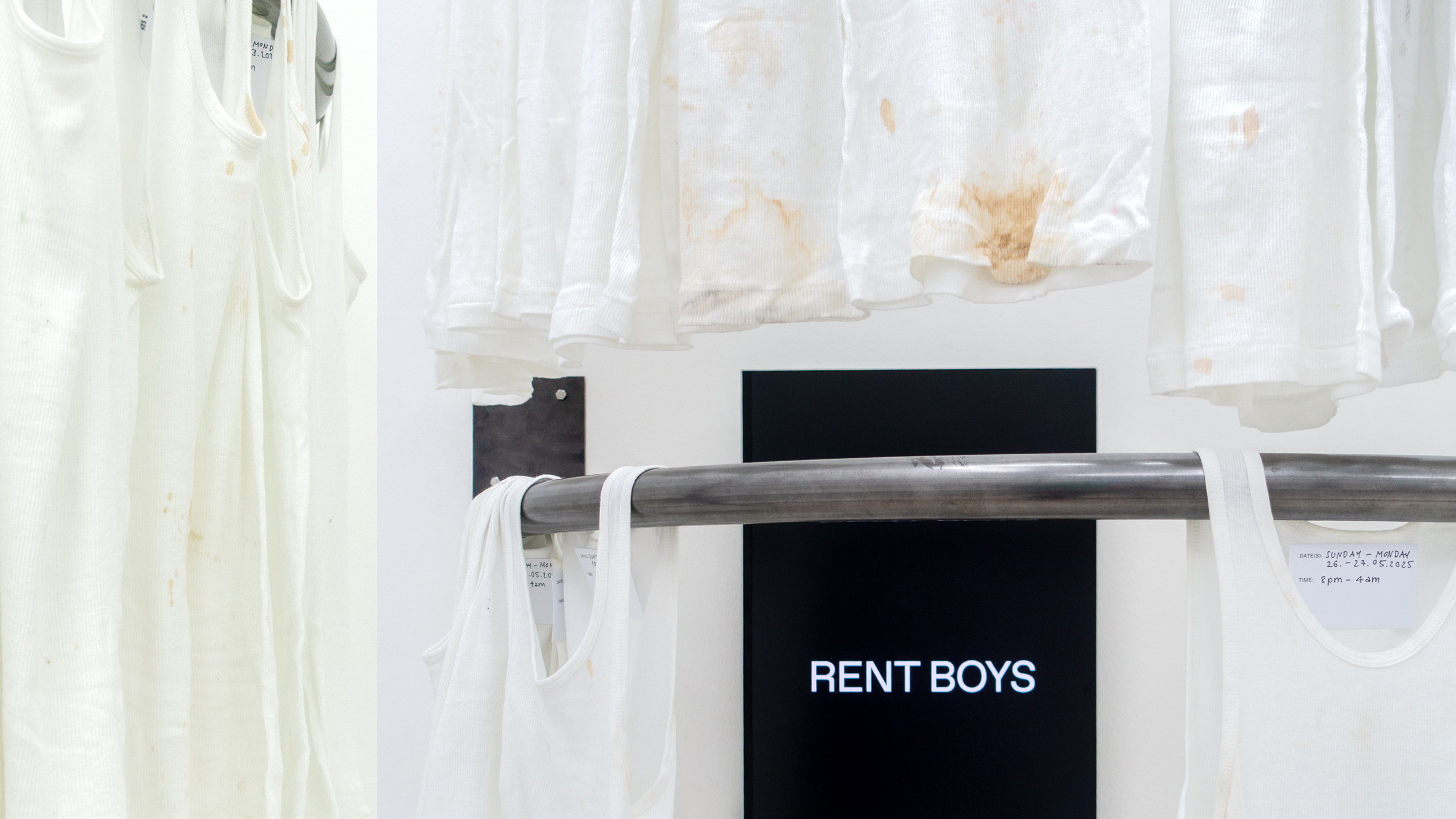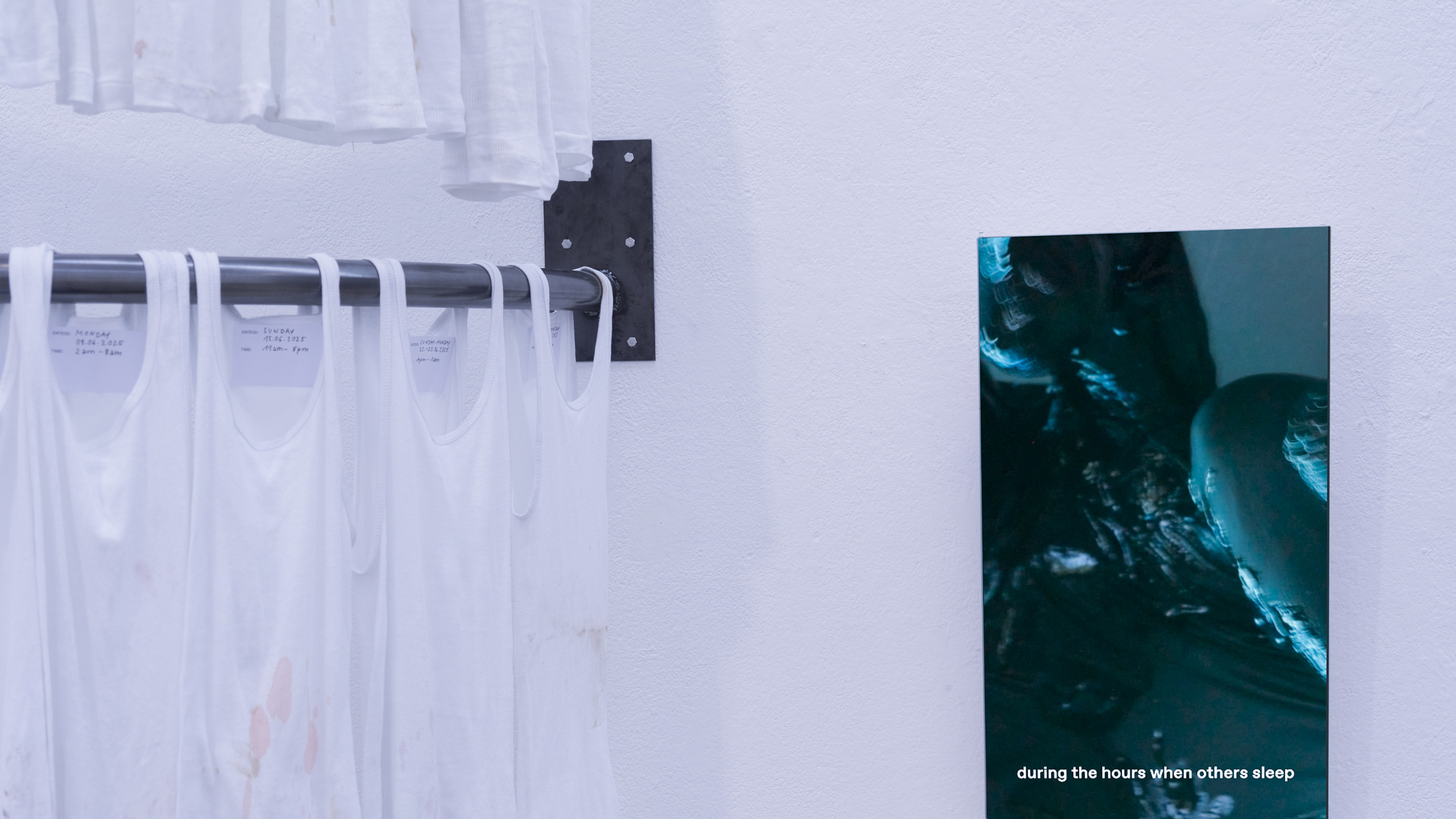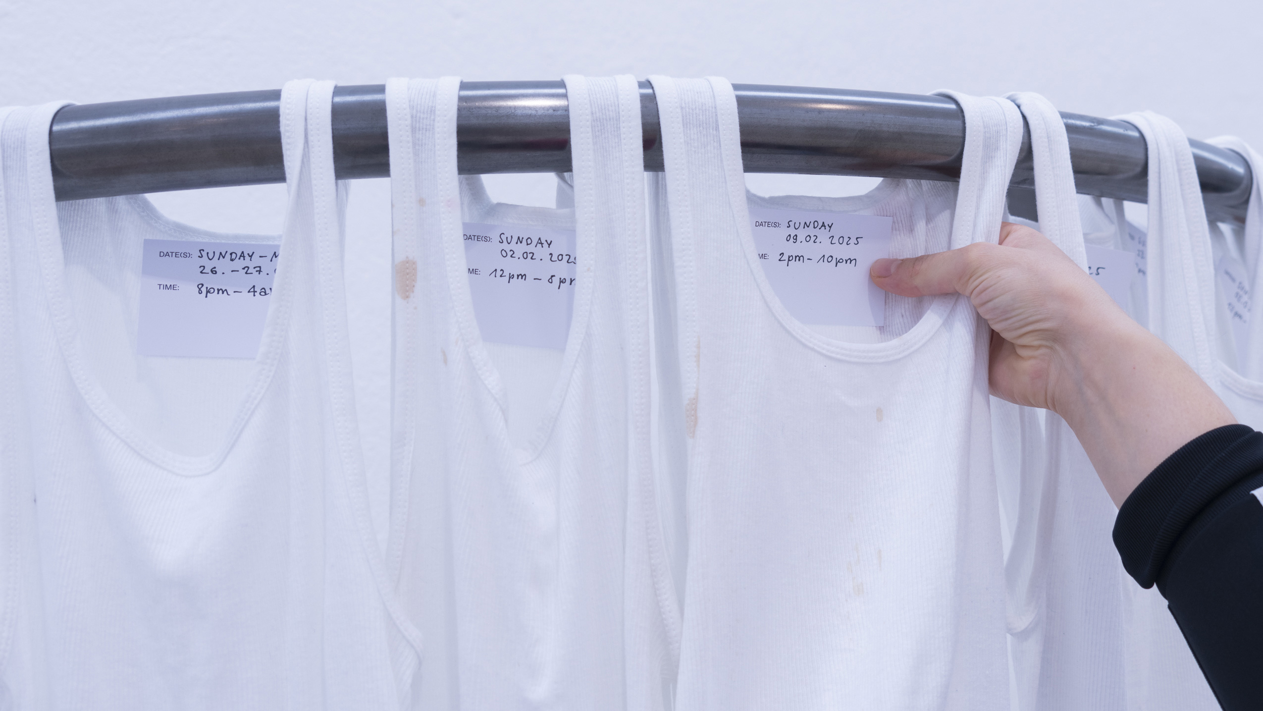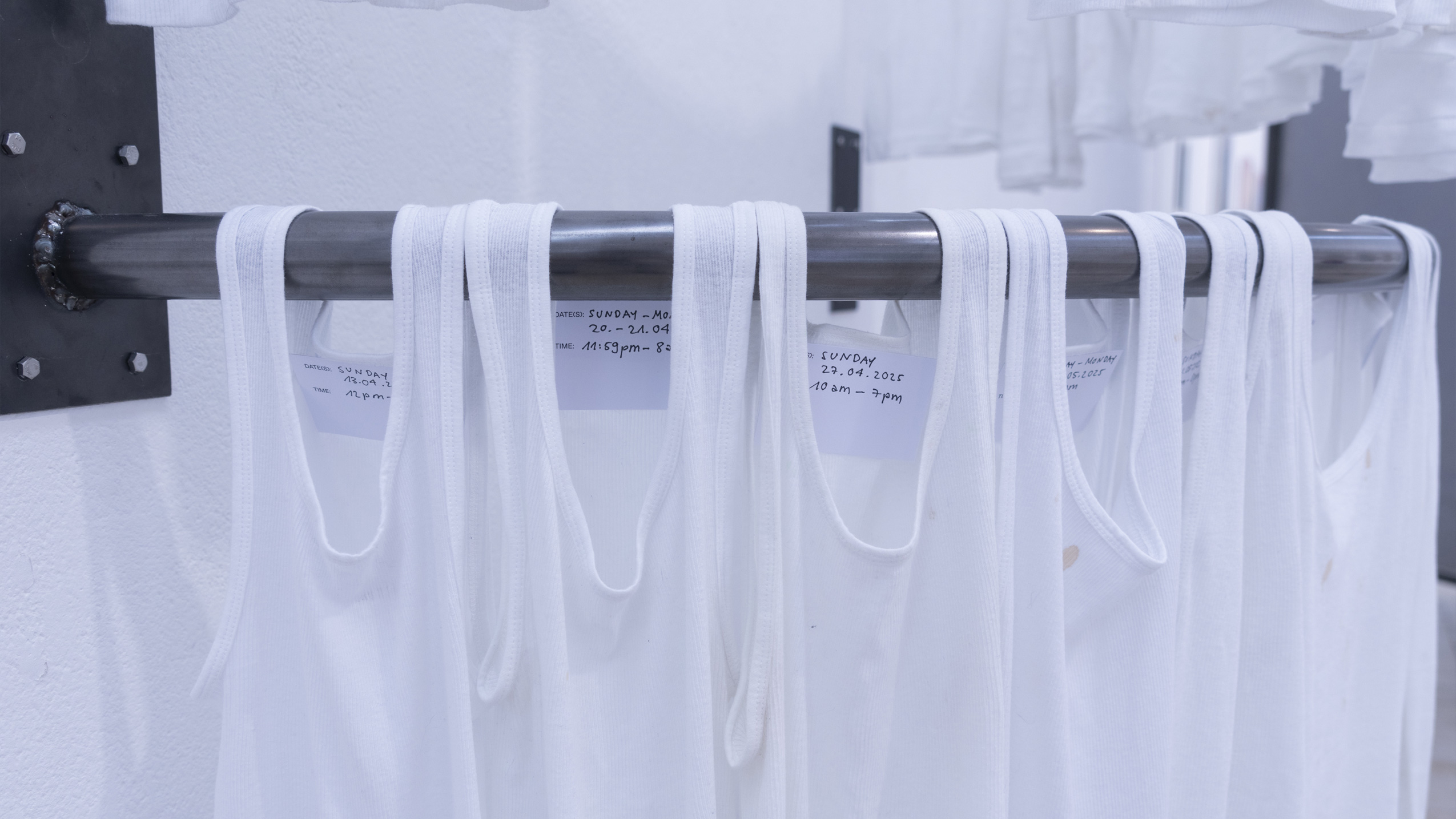 (en) SUNDAY/MONDAY collects 27 standardized, white tank tops (colloquially referred to as wifebeaters) that were worn while working as a bartender at a club. The shifts took place on Sunday and/or Monday, colliding with the temporality and structuring of the week as determined by hegemonic society. The tank tops were collected and archived over a span of six months, between January and June 2025. Each one bears the traces of physical labor, the signs of wear from a shift: dirt, stains, and drink residues on the outside mix with sweat from the inside. They form a personal cartography of subcultural labor and show, in the cultural context, an aestheticized image—another failed attempt at archiving and approaching the raving experience.
