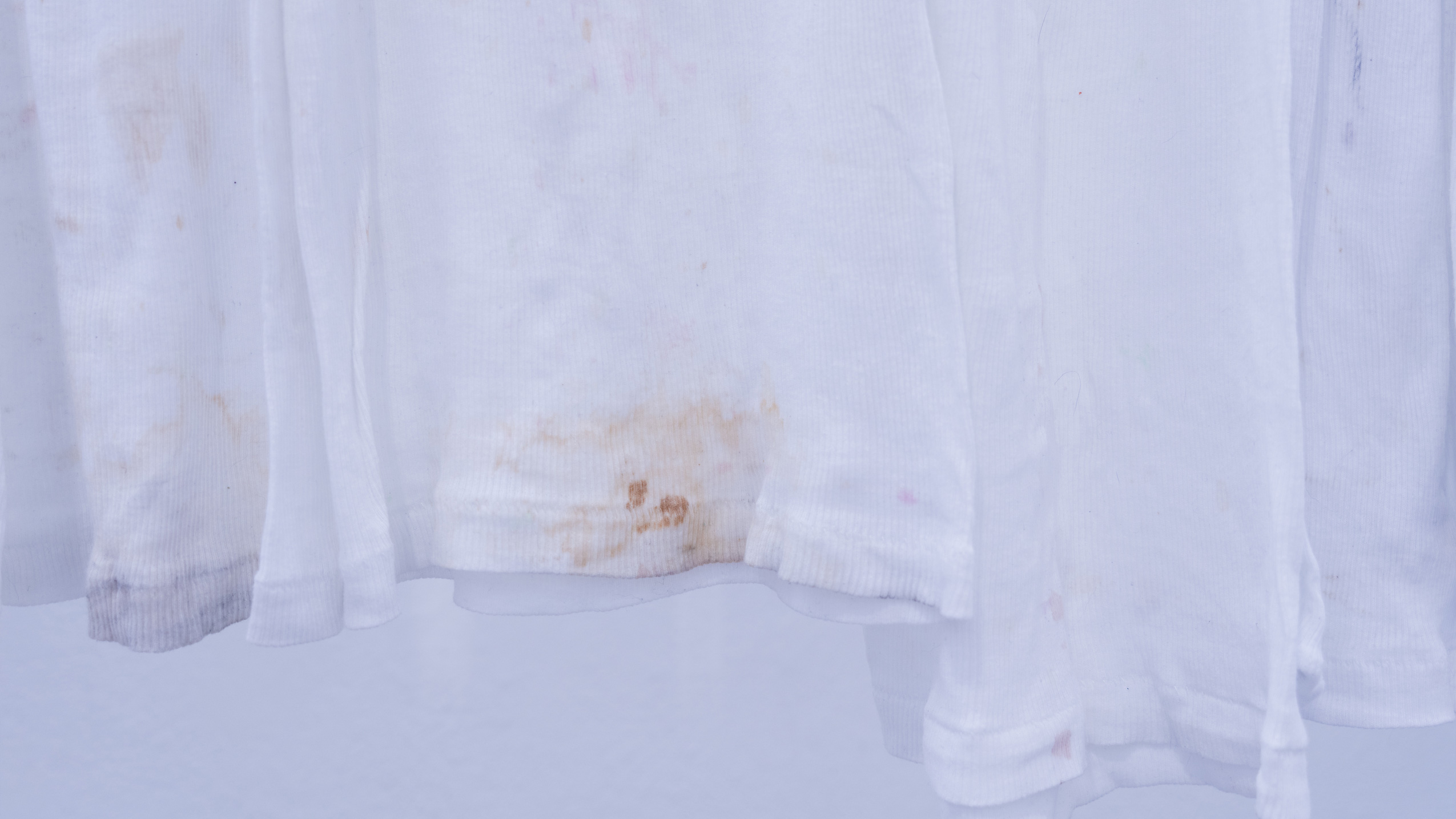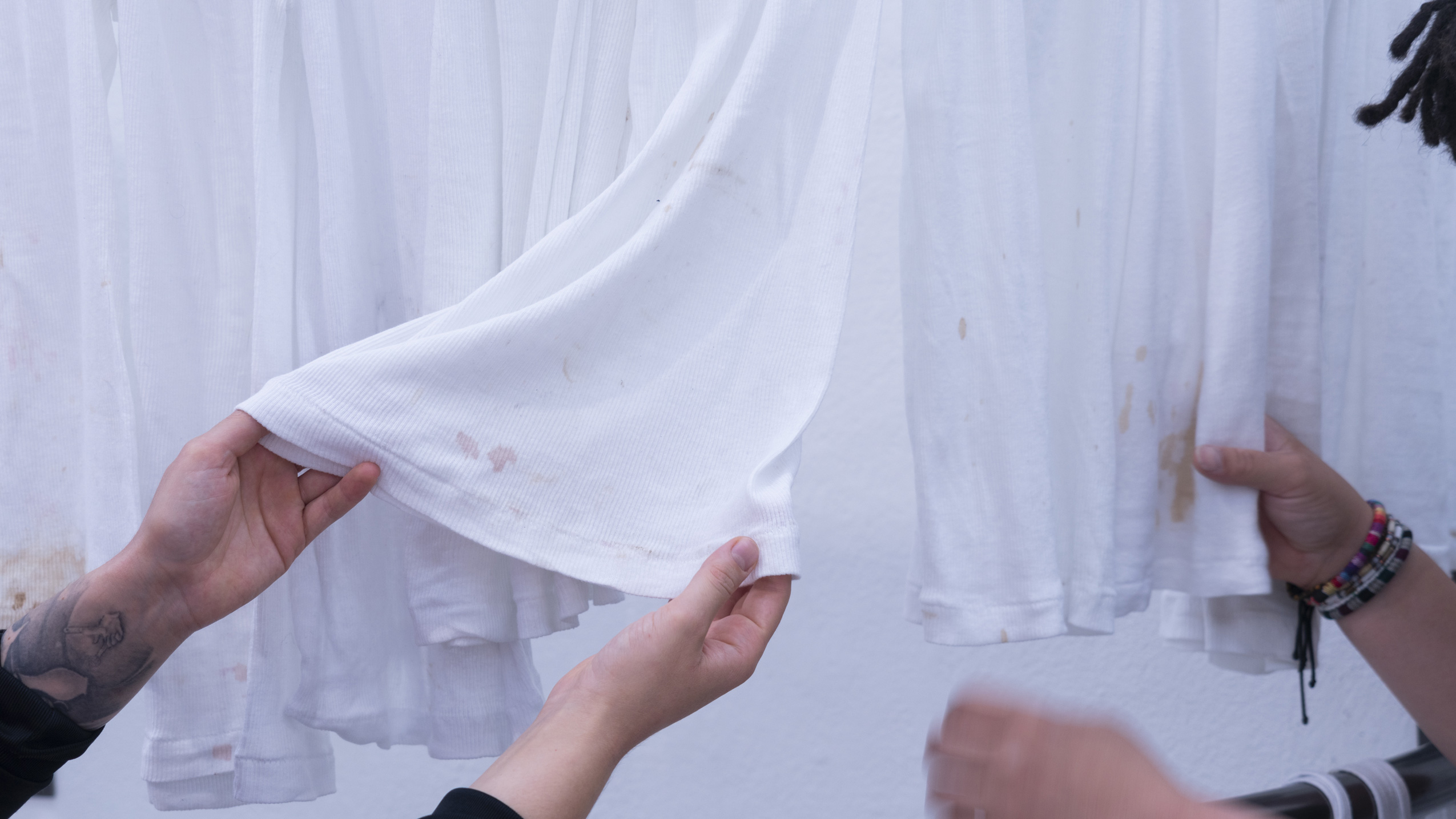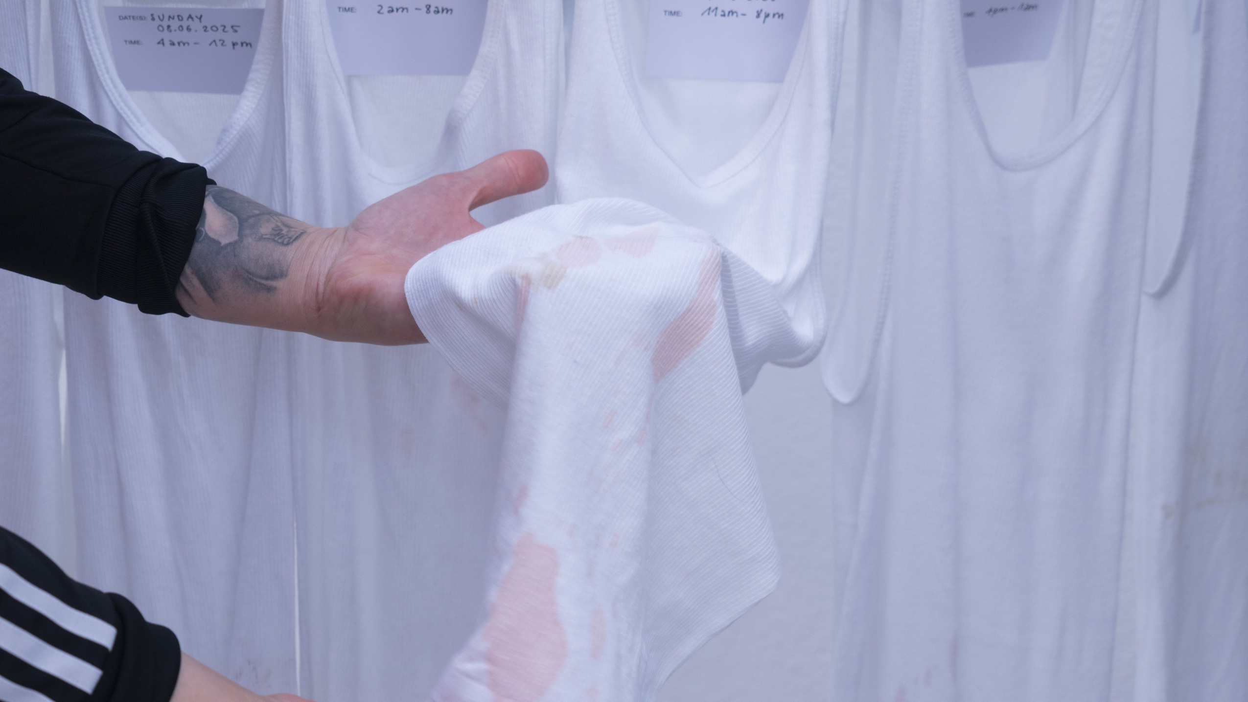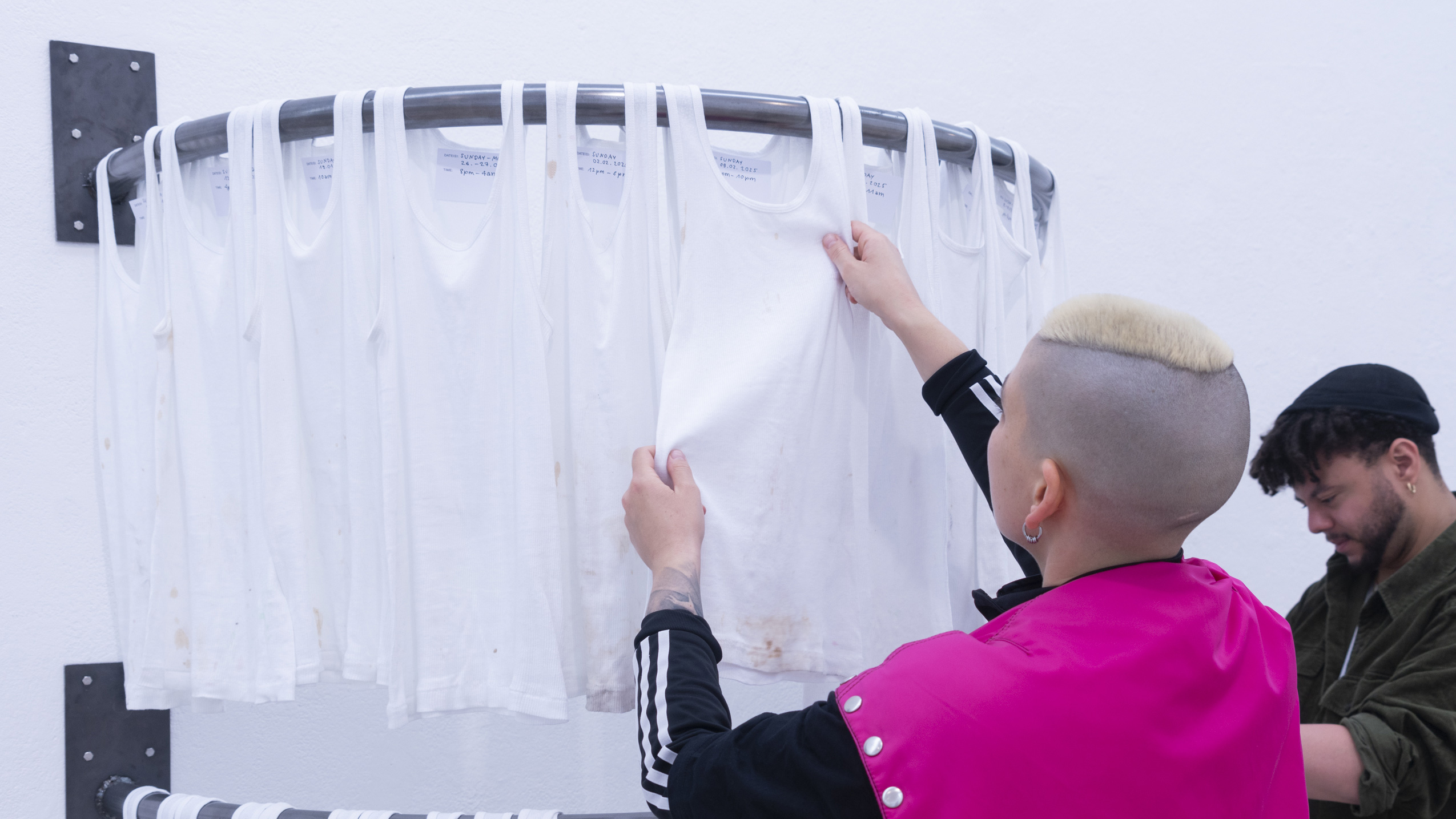 (en) SUNDAY/MONDAY collects 27 standardized, white tank tops (colloquially referred to as wifebeaters) that were worn while working as a bartender at a club. The shifts took place on Sunday and/or Monday, colliding with the temporality and structuring of the week as determined by hegemonic society. The tank tops were collected and archived over a span of six months, between January and June 2025. Each one bears the traces of physical labor, the signs of wear from a shift: dirt, stains, and drink residues on the outside mix with sweat from the inside. They form a personal cartography of subcultural labor and show, in the cultural context, an aestheticized image—another failed attempt at archiving and approaching the raving experience.