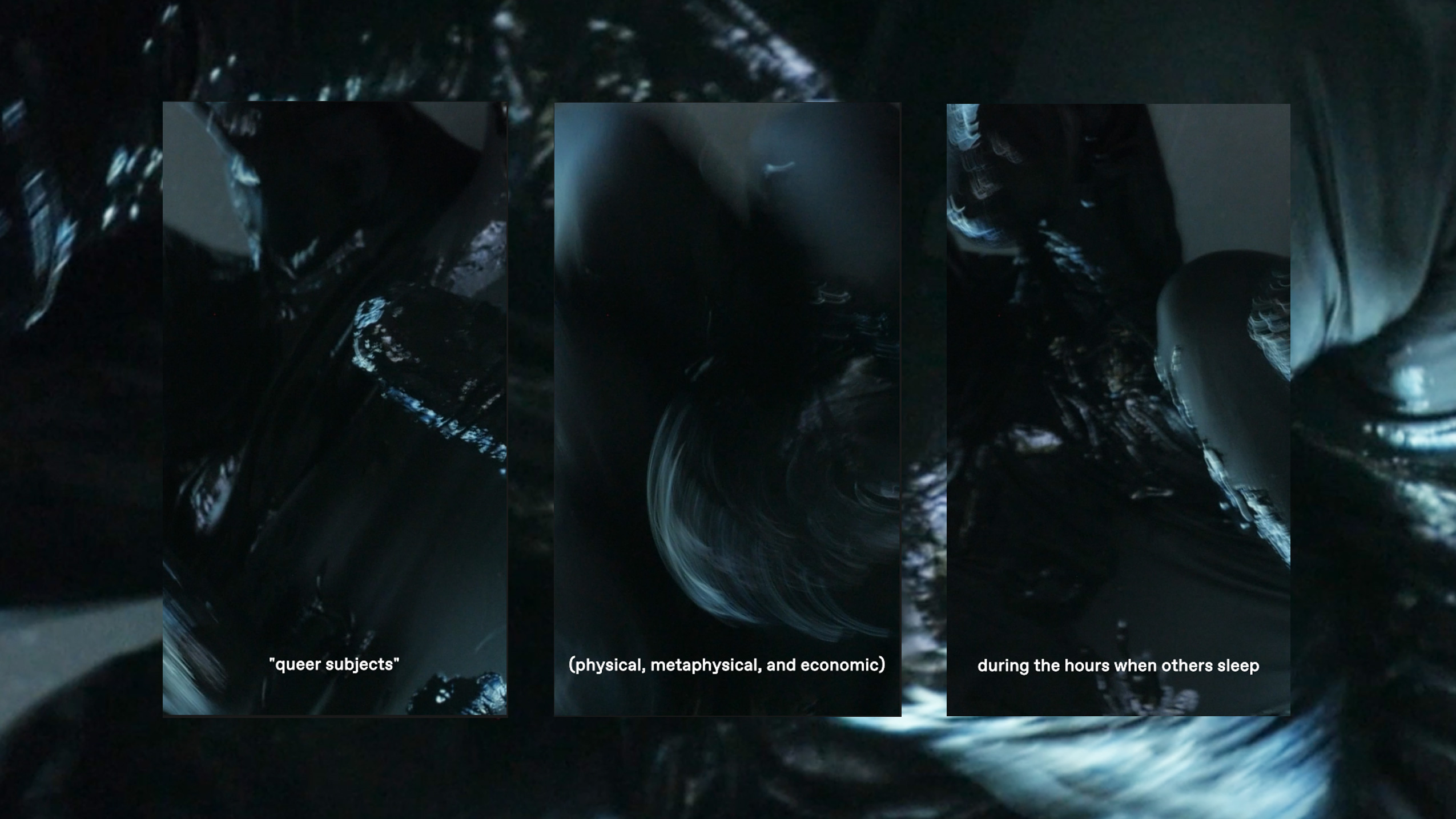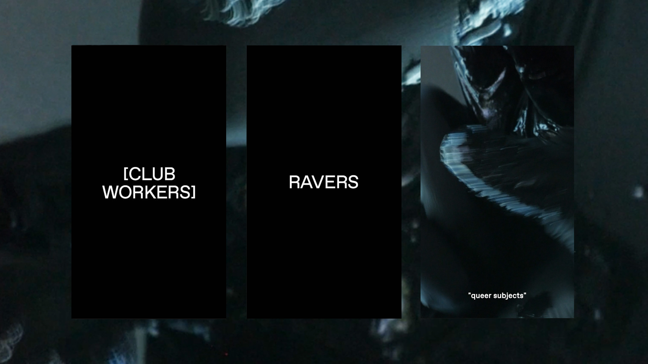 Die Installation greift in einer Videoarbeit J. Jack Halberstams Definitionsansatz queerer Subjekte auf, die sich an den zeitlichen und räumlichen Rändern heteronormativen Lebens bewegen. Die Ausgeschlossenen, Marginalisierten und Kriminalisierten, unproduktive Subjekte und Subjekte, die arbeiten, zu denen andere schlafen und sich in Räumen bewegen, die andere verlassen haben. Gerade für queere Clubarbeitende liegen diese widerständigen Räume und deren Sozietät untrennbar zwischen Privatem und Öffentlichem, zwischen Sichtbarkeit und Unsichtbarkeit und verhandeln ein Sicherheitsgefühl, das mit Unsichtbarkeit in der hegemonialen Gesellschaft einhergeht. Clubarbeitende bearbeiten die Grenzgebiete – gefangen zwischen ihrer eigenen Eingebundenheit in das System (prekäres Einkommen und ausgebeutete Leidenschaft) und der Kollision und Konfrontation mit ihm.